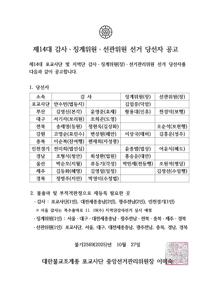 [당선자공고] 14대 감사, 징계위원, 선거관리위원 포교사단 2025-10-27 13:46:04 view : 32 제14대 감사 징계위원 선관위원 당선자 공고.pdf (51K) 등록된 댓글이 없습니다. 글쓴이비밀번호 댓글등록 보안코드 스팸방지를 위해 위쪽에 보이는 보안코드를 입력해주세요. 목록 이전글[선거재공고] 14대 감사/선관위원/징계위원2025.10.27 다음글불기2569(2025)년도 일반포교사 자격 갱신 공고문2025.10.15