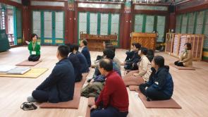 - [울산] 10월18일 금요일 오후 2시 울산세무서장님과 직원 15명이 석남사 방문하셨고 해설봉사에 공덕행님, 심일화, 심일화 회사동료 김상희님 동참했습니다. 해설요청하신 울산세무서 직원분들, 하반기 연수에 석남사로 오셨고 어제 비가 온 관계로 사리보탑전에서 심일화가 해설했습니다. 비불자, 타종교분들도 계시니 불교 역사부터 조계종의 유래, 조계종 종조 도의국사, 석남사유래, 탑까지 차근차근 풀어서 해설했습니다. 해설할때 마주치는 눈빛을 보면 알 수 있습니다. 처음 듣는 표정, 무언가 알겠다는 표정, 모두 고개도 끄덕이며 예의 바르게 또한 집중하며 들으셔서 해설하는 내내 마음을 다해 했습니다. 중간중간 질문에도 위트있게 받아주셔서 마치고 단주 선물도 챙겨드렸네요. 탑 해설 할 때는 움직여가며 열심히 경청중~ 단체로 오실때 꼭 빼놓지 않는것 중 하나가 사찰예절입니다. 처음에 방석가지고 자리에 앉으세요 하면 툭툭 던지는 소리, 발로 미는 모습이 눈에 딱 걸리면~ 보란듯이 예절 교육을 합니다. 손을 들어 삼배 시범보일 분~ 하니 앞에 거사님이 자청했고 불자답게 참 잘하셨지요. 다시 한번 방석 예절과 삼배 시범 보이며 마음가짐까지 예의를 갖추자 당부했습니다. 다음은 대웅전 팔상도 해설~ 마지막은 극락전벽화 안수정등도 해설~ 벽화해설을 해보면, 보고 듣고 난 뒤의 표정은 달라져 있지요. 각자의 마음속의 탐진치를 관찰하며 닦아 서로 배려하는 사회가 되길 기원한다며 해설 마무리했습니다. 우중에 찾아주셨다며 주지스님께서 모두 방으로 모셔 차대접 하시며 오계에 대해 법문 하셨습니다. 돌아가시면서 유익하고 감사했다는 인사 많이 받았습니다. 요~ 립밤 선물 매년 스님들께 보시하는 박계옥님~ 감사합니다. 해설준비에 오신분들께 차대접까지 두루 살펴주신 공덕행님, 함께 와서 해설듣고 가신 김상희님 모두 수고많으셨습니다.^^ 심일화/정호경( )( )( )