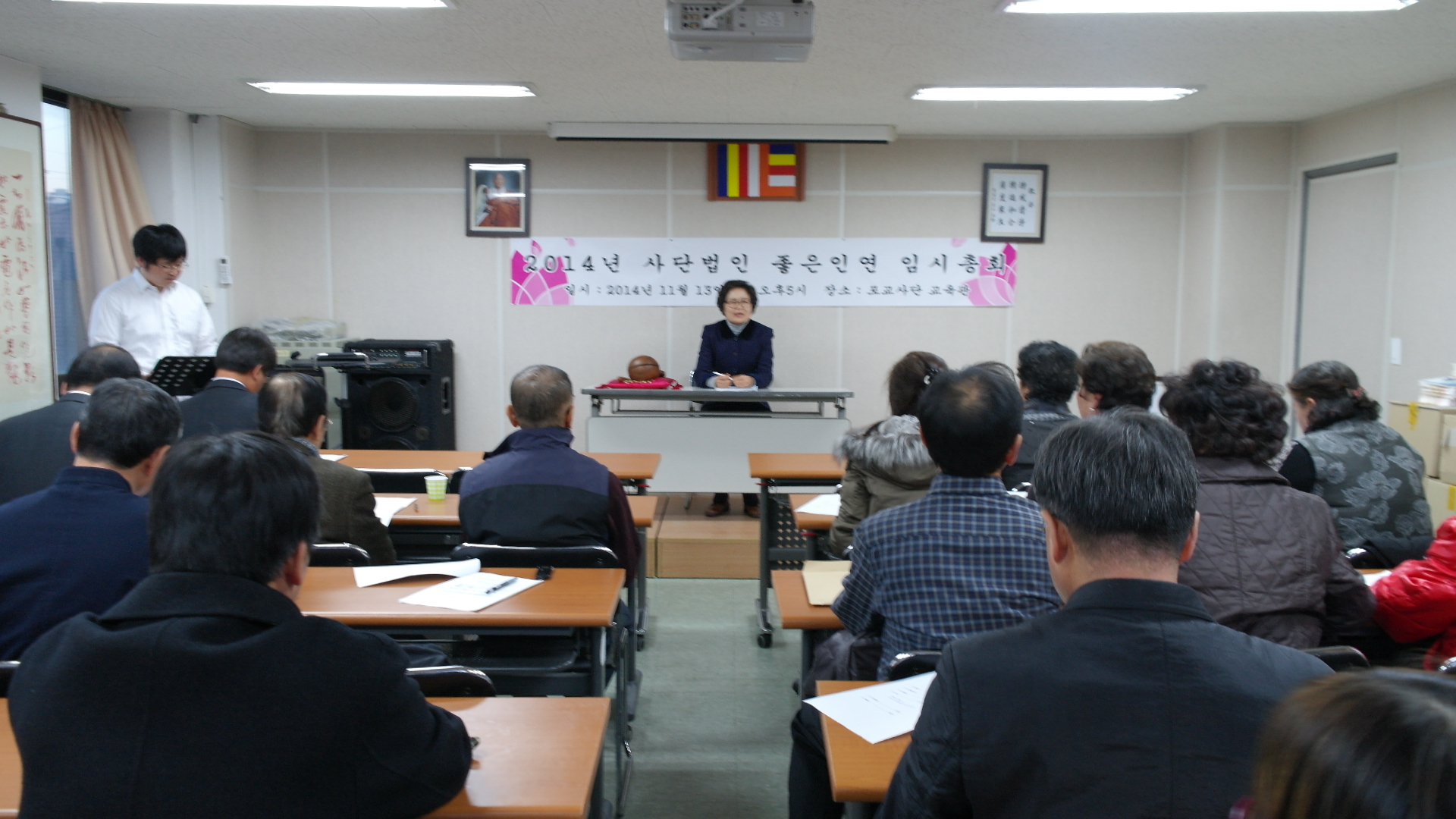 - [좋은인연] 사) 좋은인연(이사장 곽명희)은 2014년 11월 13일 17시에 좋은인연 강당에서 한창희 과장 사회로 정기총회를 열었다. 회의는 회원 150명 가운데 40명 참석, 위임자 36명으로 성원되었음을 보고한 다음 의장 인사말 전회 회의결과 보고, 사업 및 재정 보고를 듣고 나서 본안심사 순서로 들어갔다. 이번 심의된 안건은 안건 1. 부동산 매입 안건 2. 2015년 사업 계획 및 예산 심의 2개 안건으로 회원들의 엄정한 심사를 통해 모두 원안대로 승인했다 특히 이번 부동산 매입은 포교사단과 함께 장충동에 소재한 ‘우리함께빌딩’ 5층 지분매입을 추진하는 것으로 회원들의 이목이 집중된 안건이었다. 포교사단과 함께 매입을 추진하는 만큼 공동명의 방법, 법적 권리사항, 설정된 근저당을 처리 방안 등 세부적인 심사를 거쳤으며, 이번 부동산 매입을 통해 ‘좋은인연’의 활동지평을 넓히는 계기가 마련될 것으로 집행부를 비롯한 많은 회원들이 기대하고 있다. 총회에 앞서 15시부터 이사회를 열고 총회상정 안건을 심의했다