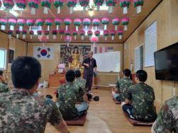 - [울산] (8월 1주차 2대대 법회 활동) 8월 2일 보현팀은 2대대에서 장병들과 법회를 가졌습니다. 오랜만에 카.톡으로 연락 받은 인원이 거의 다 온 하루였습니다. 도착하여 보니 본각 이재영 포교사님이 법당안과 밖을 깨끗이 청소하고 계셨습니다. 그동안은 날씨가 그나마 에어컨 없이 버틸 수 있는 날이 계속되었으나, 오늘은 무더위가 기승을 부리는 날이라 에어컨 가동이 되어야 하는데 오래 전부터 누전에 따른 작동 불량으로 법당 안은 온통 찜통 사우나를 방불케 하였습니다. 그러나 부처님을 뵙고자 하는 장병들의 열의는 막을 수 없었나 봅니다. 안 그래도 땀을 많이 흘리는 체질인 저는 수건으로 연신 얼굴을 닦아가며 법회를 진행하느라 힘든 하루였던 것 같네요. 오늘 처음으로 얼굴을 맞이한 장병이 3명이나 되었으며 몸 건강히 제대를 하였으면 하는 작은 바램을 가져 봅니다. 오늘은 맥도날드에서 파는 세트메뉴로 즐거운 하루를 보내고 다음을 또 기약하였습니다. 항상 장병들의 먹거리를 후원해 주시는 울산불교여성회에 감사의 마음 전합니다. 일선에서 수고하시는 "군포교팀 파이팅"입니다. 작성자:조원석/평담