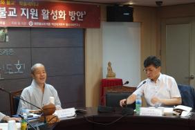 - [서울] 불기 2564(2020)년 7월 15일 13시 30분부터 18시까지 대한불교조계종 백년대계본부 불교사회연구소의 남북불교 교류 및 북한불교지원 활성화 방안에 관한 학술세미나가 전법회관 보리수 회의실에서 열렸다. 이번 학술세미나는 불교사회연구소가 호국불교연구인 현대사회와 불교 학술세미나의 일환으로 5가지 주제에 대하여 발제 25분, 토론 10분 그리고 마지막에는 종합토론의 순으로 진행됐다. 대한불교조계종 백년대계본부 불교사회연구소 소장 원철스님은 개회사에서 "남북한 불교 교류와 북한불교의 지원 방안을 살펴보는 것은 함께 살아가는 생명공동체에서 남북한이 공감대를 형성하는 방안을 도출하는 것은 지금과 같은 시기에 꼭 필요한 부분이다"라면서 "불교사상, 문화, 신행, 기도순례 등의 여러 방면을 살펴보고자 한다"고 말했다. 제1주제는 불교의 남북통일관과 북한관련 문제의 쟁점에 관한 불교적 대안에 대하여 이병욱 고려대 강사가 발제하고 유승무 중앙승가대 불교사회학부 교수가 토론을 맡았다. 이병욱 강사는 "최근 남북관계가 요동을 치고 있는데 개성의 남북연락사무소를 폭파하는 등 예상하기 어려운 일이 발생하고 관계가 좋았다가 험악했다가를 반복하고 있다"면서 "원효의 화쟁사상을 살펴보면 해답의 힌트를 얻을 수 있다"고 말했다. 그는 북한의 정치수용소에 구금된 수용자가 최소 8만-12만명 정도이고 북한의 인권문제가 대두되고 있는데 조한혜정의 연구에서 일부 지식인이 북한에 품고 있는 낭만적 민족주의에 대한 비판과 문화상대주의 관점을 예로 들면서 인권 문제에 대하여 여러 견해가 있을 수 있지만 불성은 누구나에게 있기 때문에 북한사람도 부처가 될 수 있는 고귀한 존재로서 인권이 침해되어서는 안된다고 말했다. 이병욱 강사는 한국사회가 당면한 문제를 풀기 위해서는 불교의 문화적, 사상적 자원을 활용하여 한 걸음 더 나아가면 좋겠다고 설명했다. 유승무 중앙승가대학교 교수는 토론에서 논문 3장 이전에는 원효의 화쟁사상에 근거하여 전개하는 것처럼 하다가 갑자기 불성, 연기, 방편, 자비 등의 이론이 나와서 처음에 제시한 원효의 화쟁사상을 보다 틀로 한 뒤에 내용을 전개하면 좋겠다고 말했다. 제2주제는 남북불교 교류의 패러다임과 실천적 과제라는 주제로 이지범 고려대장경연구소 소장이 발제하고 홍진호 BBS 보도국 기자가 토론을 맡았다. 이지범 소장은 "남북불교 교류는 2000년대를 기점으로 나뉘는데 1990년대 말까지는 민간차원의 교류가 추진됐다가 2000년 6.15남북정상회담을 계기로 민관합동교류 협력을 했다"고 말했다. 그는 불교 교류의 활성화를 위해서는 큰 해결방법을 찾기 보다는 작은 부분에서 도움을 주고 받는 것에서 시작하면 좋겠다"고 말했다. 홍진호 BBS 보도국 기자는 "불교계 교류를 살펴보면 각자도생인 경우를 많이 볼 수 있는데 한반도 평화와 통일을 위해서는 이념보다 실용주의에 근거하고 특정 종단이나 인사와 단체가 독점하는 것이 아닌 열린 자세로 교류를 해야한다고 말했다. 제3주제는 금강산의 불교신해오가 남북교류라는 주제로 고영섭 동국대 불교학부 교수가 발제를 하고 황인규 동국대 역사교육과 교수가 토론을 맡았다. 고영섭 교수는 "금강은 금강반야바라밀경에서 유래했는데 금강의 원어인 바즈라체디따는 번뇌를 벼락처럼 끊어버리는 능단의 뜻을 지닌다"면서 "여기에서 이름을 딴 금강산은 강원도 북부 회양, 고성, 통천, 인제의 4개 군에 걸친 명산으로 금강산 교류를 통해 남북한 교류가 있었는데 금강산은 한민족의 심성을 점화시키고 동질성을 불러오는 매개항이 될 수 있다"고 말했다. 황인규 교수는 "남북불교 교류는 정치상황의 변동에 작동하기 보다는 역사문화적 관점에서 장기적이고 지속적으로 이루어지는 것이 필요하다"고 말했다. 제4주제는 불교문화와 남북교류 그 역사적 연결 고리를 찾아서라는 주제로 유근자 동국대 초빙교수가 발제를 맡고 이경순 역사박물관 학예연구사가 토론을 맡았다. 유근자 교수는 "남북한이 통일되었을 때를 가상으로 관광지도를 그려보았는데 북한 소재의 사찰과 남한 불교계를 연결하면 관광 활성화 등 다양한 효과가 발생하기 때문에 남북한이 불교문화 교류를 통해 남북교류를 활성화하고 여러 사찰을 순례하는 등의 프로그램을 진행하면 좋겠다"고 말했다. 이경순 학예연구사는 "북한 소재 불교문화유산에 대한 구체적인 조사사업이 선행되는 것이 필요하고 심도있는 관광콘텐츠 개발이 필요하다"고 말했다. 제5주제는 남북한의 전통등 비교와 교류협력방안이라는 주제로 백창호 한국전통등 연구원장이 발제를 하고 구미래 불교민속연구소 소장이 토론을 맡았다. 백창호 연구원장은 "북한에 연등이 있냐는 질문을 듣는데 문헌적으로는 1910년대 평양 동쪽문의 대동문루의 처마에 걸린 4개의 사각등이 사진촬영된 자료가 있다"면서 "이후에는 북한의 등과 등문화가 장식용 또는 장엄등의 기능을 하고 있고 당장에는 어떤 변화를 만들기 어려울 수 있지만 앞으로 민족성과 희소성을 지닌 전통등에 대한 연구가 필요하다"고 설명했다. 구미래 소장은 "연등을 통