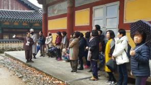 - [울산] 11월25일 월요일 서울 비구니회관 내 법룡사 신도 25명이 석남사 스님들께 대중공양 오셨으며, 사찰문화해설도 요청하셔서 원명지, 만법지님 참석했습니다. 이 날 어느 신도님 댁에 49재 회향날이었음. 선방 스님들 다 나오셔서 49재 회향에 동참하시고, 동안거 기간에는 천도재가 더 많이 더 크게 열립니다. 이 날도 엄청 큰 재 였습니다. 서울 법룡사에서 석남사로 대중공양 오신 분들 먼저, 대웅전에서 108배 하시고, 참선하시고, 점심공양 드시고 참 조용조용 정중하신 분들 이었습니다. 서울 조계사와 함께 조계종조 도의국사 설명 너무 잘 들어 주시고, 진지진지한 표정 점심공양 드시고 다시 탑 앞에서 또 해설, 비가 살살 뿌리고, 싸늘한데도 설명 더 해달라 요청하셨고 중간 중간 짬짬이 일반인들께도 해설 해설 끝에 점심공양 했냐니~ 아침도 안먹었다해서~ 그러면 우리 일행에 합류해서 공양하러 가자 했음, 참고로 석남사는 평일에 일반인들에게는 공양을 드리지 않습니다. 특히 요즘 동안거 기간에는 더 안됩니다. 선방스님들도 계셔서 평일에도 보통 백여명 분의 공양을 마련하시는데 여간 고생이 아니십니다. 이 날 기와불사를 많이 하셨지요. 49재에 참석하신 2018년도 총무스님~ 반갑다고 서로 손잡고 한참을 안부 물으며 인사 드렸네요. 같이 동참해서~ 해설에 차질없도록 이것 저것 도와주고, 눈에 보이는 절 일이 내일 마냥 솔선수범하는 만법지님 감사합니다. 원명지/이상화 ()()()