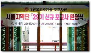 - [서울] 불기 2568(2024)년 9월 21일 오후 2시, 서울지역단(단장 강민구)은 서울 종로 3가 대각사 3층 대웅전에서 제29기 신규 포교사 환영법회를 봉행했다. 강민구 단장을 비롯하여 장영보 수석부단장, 유유재, 김순자 부단장, 안복숙 총괄팀장, 김기옥 팀장 등 임원진과 제29기 신규포교사들이 참석한 가운데 장영보 수석부단장의 사회와 김인엽 포교사 집전으로 진행됐다. 이날 신규 포교사 환영법회는 개회사, 삼귀의, 우리말 반야심경, 단장 인사말, 포교사증과 포교사 뺏지 수여, 전도선언문 낭독, 공지사항 및 기념사진 촬영 순서로 진행됐다.