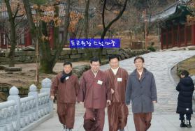 - [포교사단] 신년하례법회서 김정숙여사 불교계 성원 당부 한국불교종단협의회가 1월 18일(금) 서울 조계사에서 연 신년(2019/기해년) 하례 법회에 참석한 대통령 부인 김정숙 여사가 남-북 평화체제를 구축하는데 불교인들의협조와 성원을 당부했다. 불교종단협회가 주최한 법회에는 회장 원행스님(조계종 총무원장), 수석부회장 문덕스님(천태종 총무원장), 부회장 홍파스님(관음종 총무원장), 차석부회장 회성 정사(진각종 통리원장) 등 불교계 각 종단의 지도자와 불자 등 100여명이 참석 했다. 종단협 회장 원행스님은 법어를 통해 “100년전 3.1운동에 앞장섰던 불교계의 독립정신을 되살려 남-북이 평화체제를 갖추는데 1000만 불자들이 동참하자” 고 성원을 당부했다. 김정숙 여사는 축사에서 “지난해 남-북정상회담 때는 2 만여 불자들이 광화문광장에서 금강경 독송법회을 열어 한반도 평화를 기원했다”며 “역사의 고비마다 화합과 상생의 깃발을 들고 용맹정진한 빛나는 전통을 살려, 남-북 화해와 평화정착에 불자들의 원력을 모아달라”고 말했다. 이어서 김정숙 여사는 “마주보는 상대 눈동자에 담긴 나의 모습을 불가에서 ‘눈부처’라 한다고 들었다. 서로가 서로를 부처로 모시는 세상, 모두가 저마다의 모양과 빛깔대로 만드는 화엄華嚴세상이 되길 기원한다”고 덕담을 말했다.