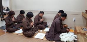 - [울산] 1, 1/7일(월요일) 저녁 7시 울산중앙병원 장례식장에 연화팀 시달림 염불봉사를 다녀왔습니다. 염불팀 포교사-법주 명산 황영규 바라지-법운 최장현 범영/이우상 묘법화/김민서 수월심/정동례 수진향/정문엽 동참했습니다. 2, 먼저 영단에 탑다라니를 설치하고, 부처님(아미타불,인로왕보살)을 모신 다음에 삼배의 예를 올리고, 그 다음 상주하고 조문을 나눈 후 울산지역단 연화팀 조문이유를 설명했습니다.