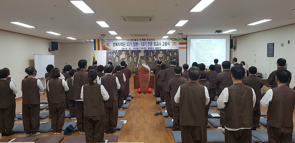- [경북] 불기2562(2018)년 9월 16일(일) 14시 경북불교대학 불광사 설법전에서 지도법사(도신) 큰스님을 모시고 경북지역단 포교사 70여명이 함께 모여 2018. 9. 8~9.9 제17교구본사 금산사에서 18회 팔재계수계법회에 참석하여 품수 받은 경북지역단소속 12기 전문포교사와 23기포교사 고불식을 봉행했다. 품수 받은 포교사들은 부처님 전에 헌향·헌화하고 삼귀의 한글반야심경, '붓다로 살자' 발원문, 포교사의 다짐, 포교사의 노래, 보례진언, 고향게, 거불, 고불문 낭독에 이어 지도법사스님의 포교사증 수여 및 단장의 배지 달아주기, 선후배포교사간 인사 순으로 고불식이 진행됐다. 포교가 곧 수행이라는 확신과 청정한 믿음으로 부처님의 정법을 수호하고 보살도 실천과 함께 항상 계를 지녀 삼업을 청정히 지니고 보시를 행하여 무소유의 삶을 실천하고 가족과 이웃의 행복을 위해 불법을 홍포하겠다는 포교사의 다짐과 더불어 불법승 삼보를 삶의 의지처로 삼아 나와 너, 우리 모두가 붓다임을 한시도 잊지 않으며 온 세상이 생명평화공동체가 되는 그날까지 붓다로 살기위해 쉼 없이 정진하고자 서원을 올렸다. 이희철 단장은 오늘 고불식에 동참한 23기, 12기 포교사님께 다시 한 번 축하드리며, 지금부터 탐, 진, 치 삼독을 내려놓고 새로운 삶을 사는 것으로 마음을 내어야 할 것입니다. 우리 인생의 위기는 초심을 상실할 때 찾아옵니다. 초심을 상실했다는 것은 교만이 싹트기 시작했다는 것이고 마음의 열정이 식기 시작했다는 것입니다. ‘초발심시변정각’ 즉, 초발심이 곧 정각을 이룬다는 경전말씀처럼 처음 일으킨 마음 변치 않기를 바라며 ‘우보익생만허공 중생수기득이익' 중생위한 보배비가 허공에 가득하여 중생을 이익 되게 하는데 중생은 자기 그릇에 따라 이익을 얻는다고 합니다. 자등명 법등명으로 스스로 마음에 등불을 밝히고, 부처님이 설하신 법의 등불을 밝혀서 사바세계를 수행하며 살라는 가르침 명심 또 명심하시길 발원합니다.”고 말했다.