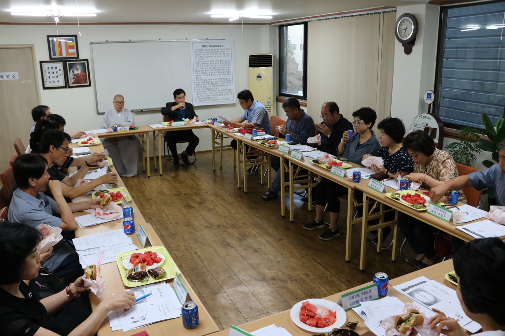 - [인천경기] 제8차 운영위원회 회의 포교사단 인천경기지역단 제8차 운영위원회 회의가 불기 2562(2018)년 8월9일 목요일 오후7시 운영위원 24명이 참석하여 등혜 배동학 수석부단장의 사회와 수연성 백순심 부단장의 집전으로 삼귀의례, 한글반야심경독송, 단장 인사말, 경과보고, 감사보고, 안건심의, 공지사항, 사홍서원으로 진행 되었다. 무인 신호승 단장은 인사말에서 연이은 무더운 날씨에도 포교활동에 임하시는 운영위원들에게 감사를 표했고 더위에 지치지 않게 건강 잘 챙기시라 당부하셨다. 이어 권태근감사의 2018년 상반기 감사보고가 있었고 안건심의와 공지사항 전달등으로 회의를 마쳤다. 이번 회의에는 디지털대학 양흥식 교학처장이 방문하여 2019년 개편되는 디지털대학 전문포교사과정에 대한 자세한 설명이 있었다.