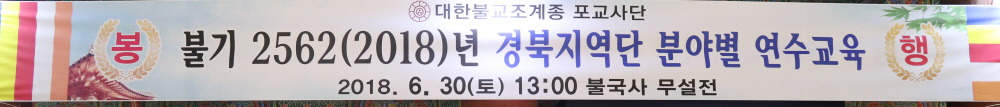 - [경북] 불기2562년(2018) 6.30(토) 13:00 조계종 제11교구 본사 불국사 무설전에서 270여명의 포교사들이 참석하여 경북지역단 분야별 연수를 봉행하였다. 이희철 경북지역단장은 “2016년 창단법회를 시작으로 새롭게 태어나서 부처님의 전도선언을 실천하는 전법사(傳法史)의 한 획을 그었으며, 나날이 새로운 결과를 만들어내고 있으며 전법 실천행은 우리 지역의 포교사 한분, 한분의 보현행원의 집결이며 불은(佛恩)에 보답하는 불자의 실천행이라 할 것”이며 “현재 한국불교는 위기상황으로 불자의 감소와 제2의 종교로 전락되었다는 뼈아픈 현실에 처해있으며 이는 포교의 시대적 사명과 요청을 다시금 일깨워 준 현실로 자각을 해야하고 활동의 재점검을 통한 혁신과 윤리포교,행복포교,가치포교로 풀어내어야만 하는 과제이며 이번 연수는 더욱 더 큰 의미를 지닌다”고 했다. 분야별 연수는 일정표에 의거 식전행사,입재, 특별법문(불국사 주지 종우 큰스님), 특강(지도법사 도신 큰스님), 지역단 특강(강의수 수석부단장), 분야별 사례발표, 분야별 토의 및 발표, 지역단장 평가 및 회향 순으로 진행되었다. 이 날 총재상에는 군포교 화랑선원팀 김호근, 포교사단장상에는 불교문화해설 경주팀 김성광, 제11교구장상에는 염불포교황련팀 김미경, 경북지역단장상으로 신행상담팀 이재중. 불교문화해설포항팀 송 원. 군포교원효팀 이인숙. 불교문화해설직지팀 최필수. 군포교화랑선원팀 김금자 등 8명이 수상했다.