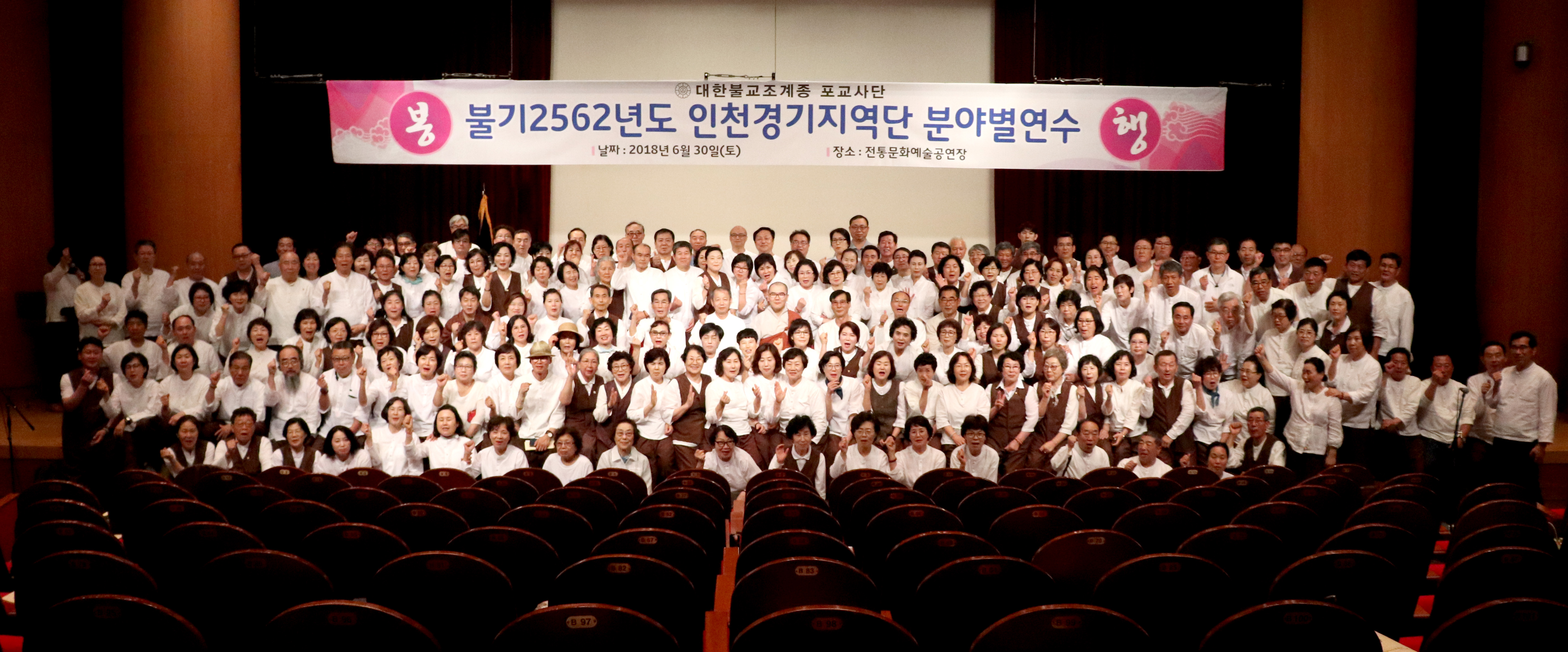 - [인천경기] 인천경기지역단 2018년 분야별연수 포교사단 인천경기지역단 분야별연수가 불기 2562(2018)년 6월30일 오후1시 한국역사문화기념관 지하 전통문화예술공연장에서에서 지역단 포교사들이 참석하여 안금녀 교육위원의 사회로 봉행됐다. 붓다로 살자 구호와 포교사의 다짐, 포교사의 노래를 함께 하였다. 무인 신호승 지역단장은 인사말에서 주변 환경에 흔들리지 말고 포교활동을 해야하며 처음 세운 서원을 잊지말고 활동에 임해주시고 모든이의 모범이 되는 존경받는 포교사가 되자 당부하셨다. 보윤 이형 포교사단 전문위원이 포교사단장 인사말을 대독했고 포교현장에서 열심히 활동하신 포교사들의 포상이 있었다. 이어 지도법사이신 봉선사 포교국장 용안스님의 특강이 진행됐고 군 포교, 교정교화 포교, 불교문화해설 포교에 대한 활동 사례 발표와 평가회를 끝으로 연수가 마무리 되었다. 삶을 지혜롭게 마음을 자비롭게세상을 평화롭게 지금 여기 - 붓다로 살자