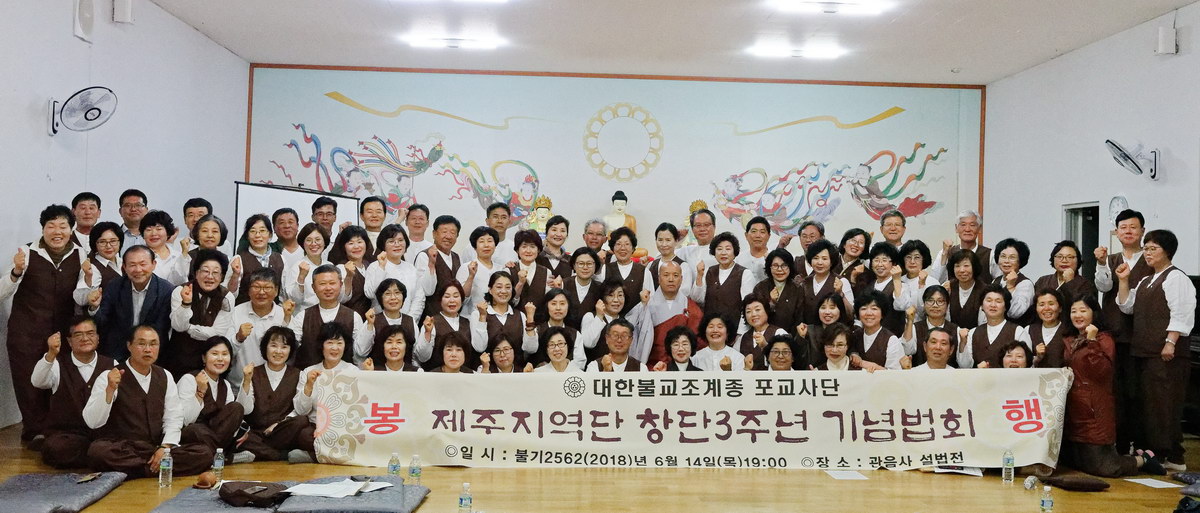 - [제주] 불기2562년 6월14일(목) 저녁7시 관음사 설법전에서 제주지역단 창단3주년 기념법회를 가졌습니다. 예불, 정근 및 축원, 삼귀의, 한글반야심경, 포교사의 다짐, 지역단 경과보고, 공로패수여, 지역단장 인사, 주지스님 법문, 포교사의 노래, 공지사항, 사홍서원 순으로 법회가 여법하게 봉행되었습니다.혜청스님은 매월 넷째주 일요일 저녁7시 관음사 설법전에서 제주지역단 정기법회에 참여하여 수행과 기도를 꾸준하게 하면서 마음을 정화시키는데 노력해야한다고 법문해주셨고, 주지스님은 나는 불자인가? 라는 화두로 포교사들부터라도 부처님 경전을 많이 읽어야 한다며 법화경 제4 신해품-2 궁자의 비유를 예를 들며 뜻깊은 법문을 해주셨습니다. 매월 넷째주 일요일 저녁7시 관음사 설법전에서 해청스님과 함께 하는 제주지역단 정기법회에 많은 포교사들의 관심과 참여를 바라며 함께 하는 모든 포교사의 가정에 부처님의 가피가 가득하길 바랍니다_()()()_