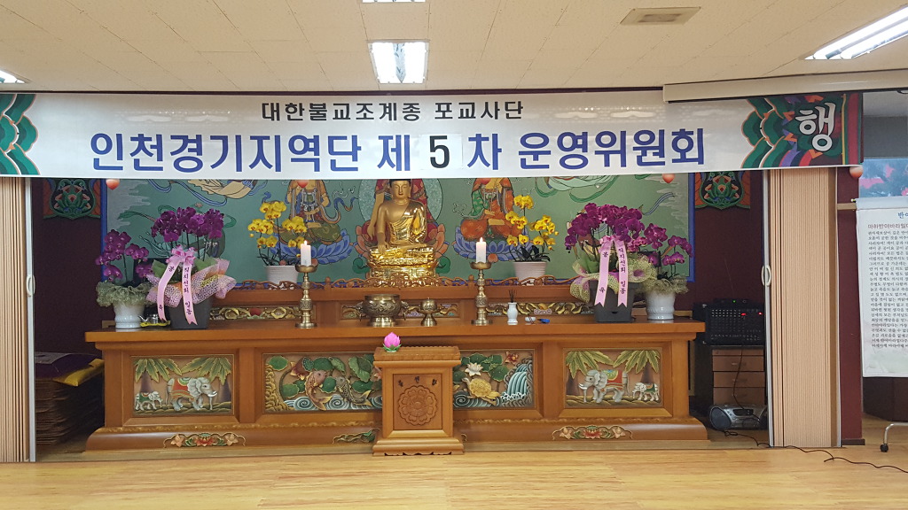 - [인천경기] 제5차 운영위원회 회의 불기 2562(2018)년 5월10일 오후7시 지역단 사무실에서 제5차 운영위원회 회의를 운영위원 20명이 참석하여 배동학 수석부단장의 사회와 백순심 부단장의 집전으로 삼귀의 ,한글반야심경봉독, 포살법회,단장인사말, 경과보고, 안건심의, 공지사항, 사홍서원순으로 진행 하였다.붓다로 살자 실천 계획의 일환으로 포교원에서 제작한 포살법회 의식집으로 지난달에 이어 두번째로 포살법회를 봉행 하였다.신호승 단장은 인사말에서 부처님오신날을 맞아 인천에서 행해진 연등축제가 여법하게 진행됨을 감사하게 생각하고 며칠뒤 행해지는 수원연등축제에서도 많은 도움을 당부하시고 어려움속에 힘듬을 이겨내고 우리의 자리를 찾아가자고 하셨다.이어 안건심의와 공지사항 전달등으로 회의를 마쳤다.