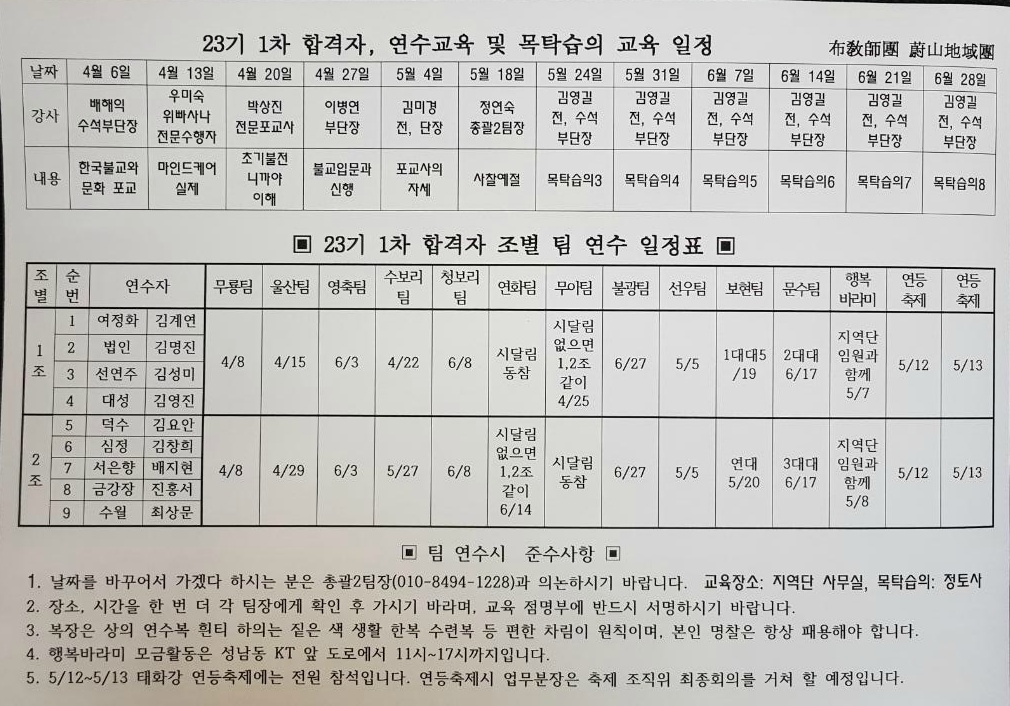 - [울산] 제 23기 포교사 1차 합격자 2차 지역단 연수가 시작되었습니다.2차 연수는 지역단이 주관해서 1차 합격자들을 대상으로 이론 및 실기교육과 팀활동, 봉사활동, 행복바라미 활동 등에 참여시켜 포교사로서의 역량을 갖추게 하고 또한 포교사로서의 자질을 갖추고 있는지에 대한 평가도 하는 중요한 일입니다.2차 연수는 이론교육 6회와 목탁습의 6회 팀활동 11회, 행복바라미 동참, 연등축제 동참 등의 내용으로 구성했습니다.교육은 주중에 하고 팀활동은 주말에 해서 매주 두차례로 교육을 받아야 하는 빠듯한 일정입니다. 이는 선배 포교사가 모두 겪은 교육과정이라 1차 합격자들도 이해 하리라 믿습니다. 어제 저녁에 이론 교육 첫 시간을 본 지역단 수석부단장이신 평담 배해익님께서 해 주셨습니다. 대상자 8명 중 1명이 결석하고 7명이 교육을 받았고 진행 준비 등 실무는 단장이 했습니다.평담수석부단장님은 '사찰문화 해설'에 대해 깊은 지식과 정확한 교수법을 지닌 분으로 2시간 강의 내내 온화하면서도 쉽게 설명을 해 주셨고, 해설사의 태도와 방법, 그리고 경전 등 불교 신앙의 강조 등 좋은 내용의 교육을 해 주셨습니다.후기는 ~ 석전단장님^^