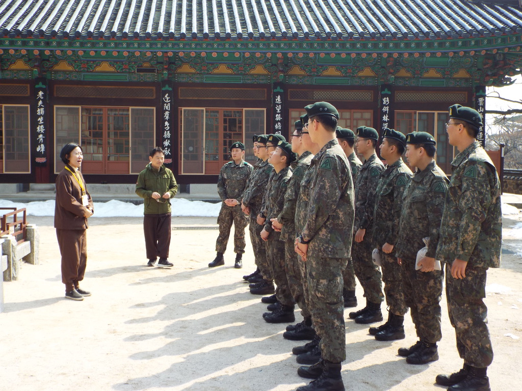 - [울산] 3월24일 음력 2월8일(부처님 출가재일)토요일군포교팀에서 묘각/전기택님, 무상행/유영아님과 장병 20여명이 석남사 방문했습니다. 작년 10월에 석남사 방문하고, 두 번째 오신다고 했을때 어떻게 하면 뜻깊은 시간이 될까~해설과 운력, 공양, 석남사에서만 체험할 수 있는 선방 정수원 체험까지를 원명지팀장님과 팀원들이 머리 맞대어 작전을 짰지요. 그리고 일이 주어지면 뜻을 함께하고 의기투합하는 울산팀이기에 성심성의껏 군포교팀을 맞이했습니다.아침 9시에 와서 공양간에서 점심공양 준비하고 있었던 보리왕님과 절마당에서는 공덕행님, 심일화, 정행님의 인사와 석남사 소개가 있었고 무상행님과 묘각님의 따뜻한 카리스마와 장병들의 단합된 마음이 절마당을 가득채웠습니다.첫 일정은~ 불교문화 해설로 시작 심일화가 먼저 합장과 사리탑, 탑돌이 예절에 대해 해설하니, 진지하게 잘 듣고 줄 맞춰, 각 맞춰 탑돌이도 멋지게 하고 대답도 시원시원~ 역시 불자들이구나 뭉클함이 밀려왔습니다.두번째 일정은~ 사시예불 참석해서 함께 예불 드리고 예불시간 끝난 후 좌복과 삼배 예절에 대해 시범보였는데, 대웅전을 처음 와본다는 군인도 있어 법당 예절에 대해 자세하게 안내했습니다. 잠시 오가는 얘기에 아직 군법당이 마련되지 않아 부대 안, 신발도 벗을 수 없는 도서관 한 켠에서 예불을 올린다는 말씀에 마음이 짠했고, 십시일반 포교사들의 동참을 바란다는 원을 보이시던 묘각님~ 이날 온 장병중에 군종을 꿈꾸는 군인도 있었는데 청년 불자들이 부처님 법을 마음껏 공부하고 뜻을 품을수 있는 법당이 생기길 진심으로 기도합니다. _( )_세번째 일정은~ 공양하기전 해설사팀에서 준비한 빵과 우유로 간식타임한 뒤, 눈치우기 운력했습니다. 며칠전 소복하게 내린 눈이 녹지않아 사리보탑전과 강선당 앞에 쌓여있는 눈을 깨끗하게 쓸고 치우고~ 다함께 하니 시간도 금방갔네요.네번째 일정은~ 다함께 공양게송과 함께 맛난공양 후, 전날 미리 스님께 부탁드려 정수원 선방 체험했습니다. 무행스님의 대한불교 조계종의 간화선 수행법에 대해, 스님들이 어떻게 참선을 하는지 시범보이시고 함께 참선도 하며, 선방에서의 수행법에 대해 쉽고 재미있게 얘기해 주셨습니다. 해설사팀도 잘 몰랐던 스님들의 공부, 수행법에 대해 자세하게 알게 된 소중한 시간이었습니다. 다섯번째 일정은~ 도의국사 승탑으로 올라가 해설한 뒤 묘각님을 선두로 탑돌이, 마지막 인홍스님 승탑에서 삼배의 예를 올리고, 보내는 마음이 엄마마음, 관세음보살의 마음이라 언제든 또 오십시요.~ 서로 박수로 인사하고 모든 일정을 마무리했습니다.부처님 출가재일~ 모두 출가해서 수행 정진 한 날~ 불교의 미래 청년 불자들에게 조금이나마 도움이 되고자 모두의 수고로움과 배려, 정성이 있었지요. 먼저 흔쾌히 선방을 내어 주시고 해설에 간식까지 챙겨주신 석남사 스님들~ 장병들 잘 부탁한다며 공양보시금까지 내어주신 보리왕님, 빵과 우유 준비한 공덕행님, 사진과 운력 공양간에 팩 한박스 보시해 주신 정행님, 장병들을 인솔해 오시고 세심히 챙겨주신 묘각님과 유영아님^^ 모두모두 머리숙여 감사드립니다.^^수고하셨습니다.^^후기 ~ 사찰문화해설울산팀 심일화/정호경( )( )( )