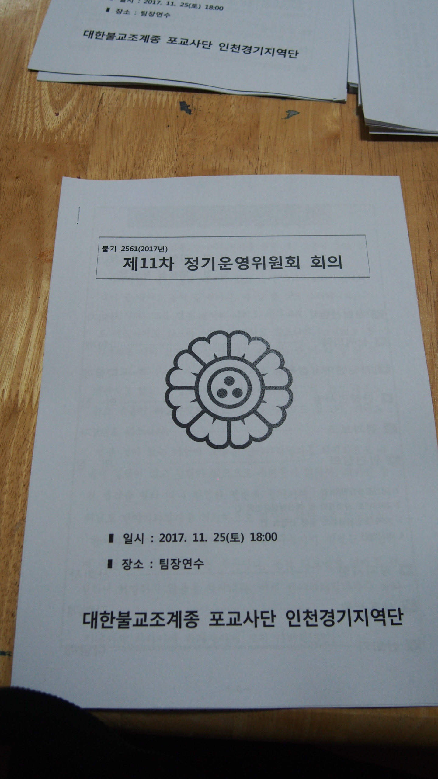 - [인천경기] 불기2561(2017년) 제10차 정기운영위원회 회의일시: 2017. 11. 9(목) 19:00장소 : 지역단사무실사회 : 이형 수석부단장집전 : 이용경 북부총괄팀장제10차 운영위원회 회의를 개최하였습니다.제 10차 운영위원회 회의 내용은 사진으로 대신합니다.오랜시간까지 회의 진행에 함께하신 운영위원님들 감사합니다~~다음 행사에서 뵙겠습니다.