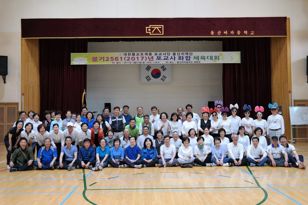 - [울산] 불기2561(2017)년 5월 21일 오전10:00~16:00까지 울산여자중학교 실내체육관에서 울산포교사 화합 체육대회를 개최하였다. 100여명의 포교사들이 참석하여 배구, 피구, OX퀴즈 등 다양한 프로그램들로서 소통과 화합을 다지는 시간을 가졌다. 1차 합격자들도 참석하여 지역단 행사에 봉사하는 마지막 기회가 주어졌고 각 팀에서도 팀장이하 많은 팀원들이 참석하여 참가상, 행운상, 특별상등을 함께 하며 즐겁고 유쾌한 시간을 가졌다.