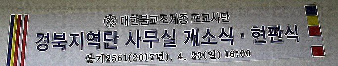 - [경북] 2017. 4. 23(일) 16:00 대한불교조계종 포교사단 경북지역단 사무실 개소식을 경산시 옥곡동 소재 우방유쉘아파트 상가 2층에서 가졌다.현판 제막식 및 탱화 점안식,반야심경 봉독후 경과 보고에 이어 내빈 소개, 도신 큰 스님의 인사말씀과 경북지역단장의 인사말씀, 대각화 권대자(대구지역단 고문)의 축사가 있었다.축하떡 케이크 절단과 구호제창 및 기념촬영으로 개소식을 마무리 했다축하해 주신분들보경 스님(전 김용사 주지), 전 대구지역단장 장한상(정법). 전 대구지역단장 이용우(여광) 대구지역단 수석 부단장 방창덕(향천) 대구지역단 사무국장 대덕.화환 보내주신분들포항불교 신도연합회. 대한불교 선종종회 의장 용현 스님. 제16교구 포교국장 유하사 주지 동우 스님.정법 장한상 님.