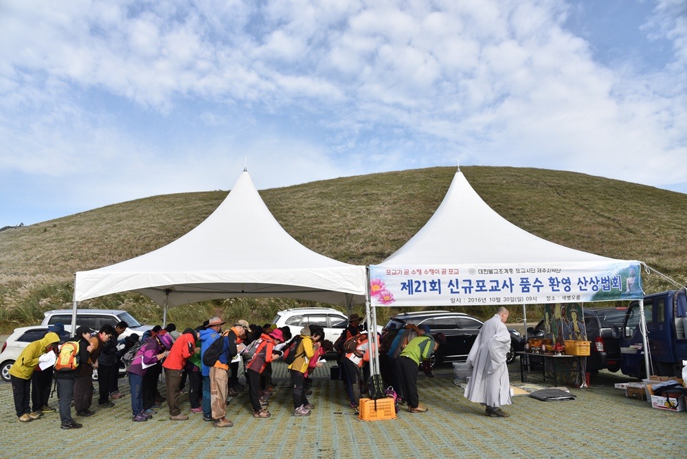 - [제주] 불기2560년 10월 30일 포교사단 제주지역단(부단장 허인영)은 제21회 포교사 품수를 축하하고 지역단의 단합을 다짐하는 산상법회를 새별오름에서 봉행하였습니다. 지도법사이신 해청스님께서 법문을 통해 21기 포교사들이 함께 하게 되었으므로 제주지역단이 더 화합하고 발전하는 계기로 삼아 모두가 한마음으로 불법 홍포에 힘껏 나서주기를 당부하셨습니다. 오늘 법회는 서귀포총괄팀(팀장 현정삼)이 준비를 하였고, 강수선 서귀포염불팀장님이 목탁집전, 허인영 부단장님의 인사 말씀, 김녕규 제주시총괄팀장님의 발원문 낭독, 21기 오창석 포교사의 포교사의 다짐 낭독 등으로 진행되었습니다. 법회를 마치고 새별오름, 이달오름, 이달촛대오름을 오르내리는 오름길 걷기를 하였습니다.