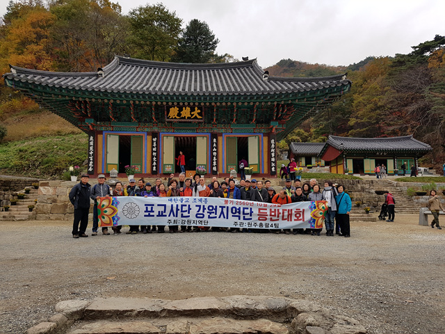- [강원] 불기2060년 강원지역단 등반대회강원지역단 (단장전상웅)은 불기2060년10월29일 지역단 등반대회를 가졌다.원주치악산 자락에 위치한 구룡사에 집결 심검당에서 포교스님의 법문을 시작으로약 2시간 가량소요되는 세렴폭포까지 산행을 실시하며, 그간에 포교일선에서 떠나깊어가는 가을을 만끽하는 하루를 가졌다.