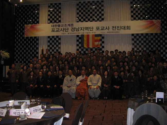 - [경남] 대한불교조계종 포교사단 경남지역단(선행심 이문자 단장)은 불기2559년 12월 12일(토) 2015년 포교사 전진대회를 창원 리베라 컨벤션 7층 루벤스 홀에서 다음과 같이 실시했다. 이날 쌍계사 총무국장 정수 스님, 포교원 신도국장 덕산 스님 외여러 내빈들께서 참석하시어 자리를 빛내주셨으며, 행사는 제1부 포교활동 소개, 제2부 개회선언, 삼귀의, 한글반야심경, 포교사의 다짐, 지역단 발자취, 내빈 및 임원 소개, 포교활동 공로 표창장 수여, 환영사, 축사, 청법가, 법문, 단기이양, 포교사의 노래, 사홍서원 제3부 저녁공양, 축하 케이크 커팅, 축하 공연, 행운권 추첨, 최다 참석팀 포상 순으로 진행되었다. 사진/ 글 : 대한불교조계종포교사단 경남지역단 중앙 홍보위원 덕산 이승선