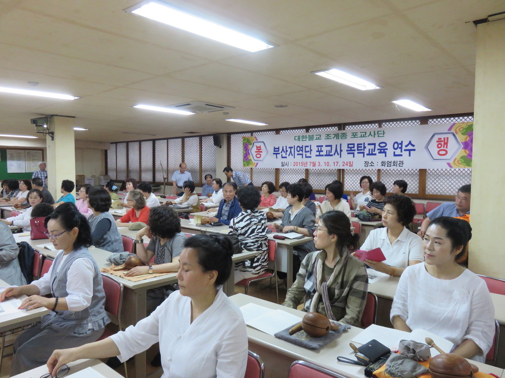 - [부산] 대한불교조계종 포교사단 부산지역단(단장 향적 강수대)에서는 포교사 들의 목탁 집전요령 향상을 위하여 2015년 7월 한 달간, 매주 금요일 오후7시 부터 9시까지 부산지역단전용 교육장 화엄회관에서 범어사 포교국장 지장 스님을 법사로 모시고 포교사 목탁교육 연수를 실시하고 있습니다. 2015.7.3, 1회차 교육에서는 17.18.19기 포교사 104명이 참여한 가운데 교육이 실시되었고, 향적 강수대 단장은 인사말을 통해 일선 포교사들의 포교 봉사 활동을 격려하고 포교사 들은, 어디 어떤 법회나 모임 자리에서도 목탁 집전이 가능할 수 있어야함을 강조하고 이번 기회에 목탁 집전 요령을 정확히 습득하도록 독려하였습니다. 참석 포교사들은 지장스님의 가르침에 따라 일자목탁.굴림목탁, 내림목탁, 올림목탁 등의 치는 방법과 적용 사례 등을 2시간 동안 열심히 숙지하고 실습하였습니다. 고송 서주석, 대덕행 박혜경 부단장을 비롯한 임원들도 교육연수에 동참하여 교육의 열기가 한결 고조되었습니다.