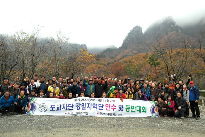 - [강원] 가을이 깊어가는 불기 2558년 11월 7일 강원지역단 정기연수 및 등반대회를 강원지역단 4개팀 약 150여 포교사들이 동참한 가운데 민족의 명산 설악산 외설악의 품에 그림같이 자리한 제3교구 신흥사에서 봉행되었다. 대공 이주진 강원지역단장의 인사말. 행사를 주관한 해일 김웅래 총괄 3팀장의 인사말. 신흥사 교무국장스님의 문수,보현보살님의 지혜와 그 행을 비교한 법문과 계조암 등반, 계조암 법당에서 신묘장구대다라니 독송 후 하산하여 청동대불 앞에서 회향식 후 비룡폭포 입구에 위치한 다래헌으로 이동하여 정기연수 프로그램 진행 및 임원회의, 점심공양, 본단 윤기중 수석부단장의 인사말과 격려금 전달, 기념촬영 후 내년 원주에서의 일정을 기약 하면서 무사 회향되었다.