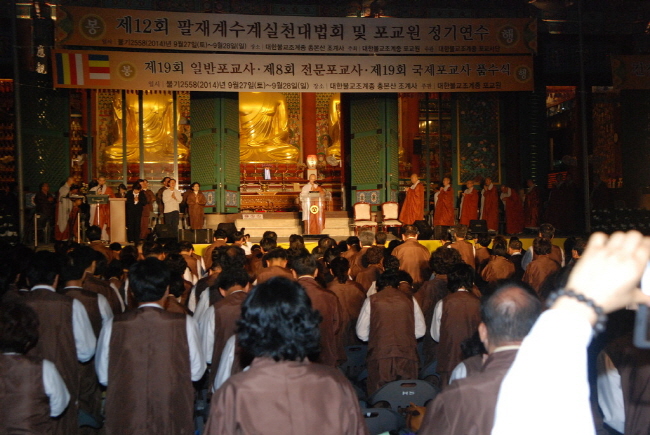 - [서울] 제12회 팔재계수계실천대법회 하루 낮 하룻밤만이라도 청정한 우바이 우바새가 되겠습니다. 불기2558년 9월27일 오후 5시.대한불교조계종 포교원 주최, 대한불교포교사단 주관으로 제12회 팔재계수계법회가 국화향기 물씬 풍기는 조계사 대웅전 앞마당에서 거행됐다. 이날 법회는, 대한불교조계종 총무원장 자승스님, 포교원장 지원스님, 포교부장 송묵 스님, 포교국장 노휴스님, 조계사주지 원명스님, 법주사 , 선본사, , 송광사, 봉선사, 용주사, 주지스님, 각 지역단 지도법사 스님 곽명희 단장, 정목희 서울지역단장, 외 전 단장, 12개 지역단 포교사, 가족 등 사부대중 1만 여명이 동참했다. 법회는 대의원 총회. 식전행사, 저녁예불, 오후불식, 입재식, 단기입장, 삼귀의, 반야심경, 포교사의 노래, 내빈소개, 인사말 , 환영사, 포상, 축가, 품수식, 붓다로 살자 특강, 8재계수계식, 철야정진, 촛불행진, 새벽예불, 보살계 수계식, 회향식, 사홍서원, 기념촬영 순으로 이어졌다. 전통문화 예술공연장에서 대의원총회가 열리는 동안 식전행사로 전통문화상설공연 강릉 관노가면극이 공연됐다. 곽명희 단장은 인사말에서, 종단의 어르신 자승스님과 관련자 스님들께 감사인사를 드린다며, 올해 품수를 받는 포교사들에게 축하의 말을 전했다 . 또한 단장은, "오늘과 내일 하루 동안 출가자가 되어 마음자리를 밝히는 팔관재계와 보살계를 수지하게 된다". 지식으로만 할 수 없는 것이기에 수행정진을 통하여 부동의 계체를 이루고 지속적인 지계실천운동으로 이 사회 모든 분들이 행복해 지는 "부처님의 전도선언" 이 이 땅위에 꽃피우게 하여야 할 것이라고 강조했다. 조계사주지 원명스님은 환영사에서, 전국 포교사들이 포교중심도량인 조계사에 온 것을 환영 한다 "계를 받는데 많은 제약이 따랐던 생활에서 하루 만 이라도 팔재계를 지켜 부처님의 가르침에 일심으로 귀의하겠다는 서원을 빌어 마련한 자리다". 또한 포교사로서 부처님의 법을 수호하고 헌신 하겠다는 원력으로 부처님의 계를 수하는 공덕만으로도 복과 지혜를 얻어 사회구성원 모두가 행복하게 살아 갈 것이다. 아함경에 "오계를 일생동안 지키는 것 보다 팔재계를 단 하루에 지키는 것이 수승하다" 라며 팔재계의 의미를 설했다. 자승스님은 법문에서, 올해로 12년째 팔재계를 해오고 있는데 포교원장스님이 취임 후 전국에 흩어진 포교사들을 모아서 지난해부터 체계적으로 활성화 시키고 있다. "내년에는 5만 불자가 광화문에서 열릴 불교 대법회를 준비하고 있다""며, "불교를 바꾸는데 스님들의 역할도 중요하지만 포교사들의 원동력이 크다고 강조하며" 1박2일 동안 배우고 느끼는 기도가 되길 바란다고 격려 했다. 이어 일반포교사 784명, 전문포교사 79명, 국제포교사 28명, 상담심리사 21명이 품수와 단복을 수여받고 부처님 전도 선언과 결의문을 낭독했다. 지원스님은 법문에서, 부처님10대 제자 중 전법 제일의 부르나 존자는 최초의 불교순교자 였다. 전법의 의지가 적극적이고 누구보다도 뛰어났으며, 전법을 위해선 그 어떠한 박해나 목숨을 두려워하지 않고 오히려 영광 이라고 생각했다, 며 "위법망구의 투철한 정신으로 불교포교에 나서달라고 당부했다.. 붓다로 살자 선언문 조계종 총본산 조계사 앞마당에 모인 포교사들은 간절히 손 모아 가슴에 새깁니다. 중생의 아픔을 내 아픔으로 여겨 한순간도 겸허와 행복의 길로 이끌었던 붓다의 고귀한 삶과 정신을 따라 지금 여기에서 거룩한 붓다로 살겠습니다. 붓다처럼 자연과 사람을 고귀하게 맞이하여 말하고 행동하겠습니다. 진실하게 말하고 행동 하겠습니다 겸허하게 맞이하여 말하고 행동 하겠습니다. 평등하게 맞이하여 말하고 행동 하겠습니다 정의롭게 맞이하여 말하고 행동 하겠습니다.. 소탈하게 맞이하여 말하고 행동하겠습니다. 소박하게 맞이하여 말하고 행동 하겠습니다 당당하게 앞으로 나아가겠습니다 붓다임을 한시도 잊지 않으며 온 세상이 풍전등화 공동체가 되는 그날까지 붓다로 정진하고 가고자 하오니 거룩한 선본이시여 저희들의 굳은 결의가 이루워 지도록 지켜주시옵소서. 마하반야 바라밀 도법스님이 곽명희 단장에게 감사패와 종정스님 친필휘호(붓다로 살자)를 수여하고 "붓다로 살자"특강이 이어졌다. 계사, 교수사, 갈마사, 인례, 유나, 모시고 팔재계 수계식이 이어졌다. * 지난 옛적 내가 지은 모든 죄업 참회 합니다., * 몸과 맘과 뜻으로 지은 죄 부처님 앞에 참회 합니다. * 하루 낮 하루 밤 이라도 청정한 우바이 우바새가 되겠습니다. 28일 12시, 경견하고 굳건한 마음으로 8재계 수계를 받은 참가자들은 누구하나 흐트러짐 없이 촛불을 하나씩 들고 관세음보살 정근을 하며 청계천 물길을 따라 돌아 장엄하고 아름다운 행진을 마쳤다. 새벽예불을 마친 후 하루 출가가 끝나고 다시 보살로 돌아가는 보살계 수계식을 마치고 기념촬영을 끝으로 팔재계를 원만 회향했다. 기사 / 홍보팀 송수옥 수연성 사진 / 홍보팀 자운 홍상기 //