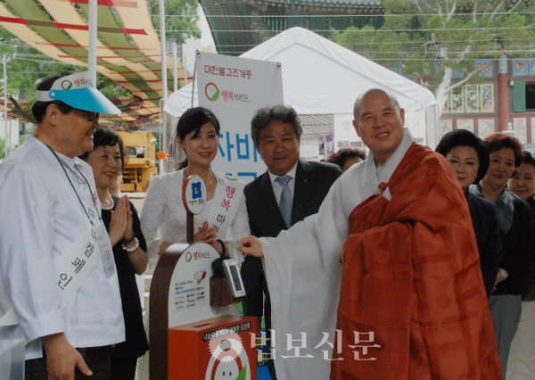 - [서울] 자승 스님, 행복바라미 모금 동참 조계종 총무원장 자승 스님이 7월3일 서울 조계사 일주문 앞에서 열린 행복바라미 나눔문화 캠페인 기부 시연행사에 참석해 신용카드 단말기 결제로 모금에 동참했다. 조계종 중앙신도회는 기부문화의 투명성을 높이기 위해 현금 모금과 함께 신용카드 단말기를 이용한 모금을 진행 중이다. 임은호 기자 eunholic@beopbo.com 이 자리에는 대한불교조계종 포교사단 곽명희 단장과 서울지역단 정목희 단장을 비롯한 많은 서울지역단 포교사들이 자리를 함께 하였다.
