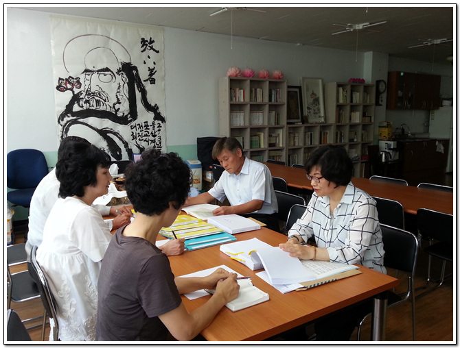 - [경남] 대한불교조계종 포교사단 울산경남지역단 2014년 상반기 감사가 26일 11시 지역단 사무국에서 실시되었다. 수감을 위해 선행심 이문자 단장, 대진 박정근 부단장, 혜안 강신 사무국장, 정진화 노덕순 간사가 참석한 가운데 지역단 감사 소임을 맡고 있는 현덕 김위영, 법성화 구말임 포교사는 사무국의 업무 처리에 대한 회무감사와 수입과 지출에 관한 회계감사로 나누어 세심한 검토가 이루어졌다. 점심시간을 훌쩍 넘겨 실시된 이날 감사에서는 1차 합격자에 대한 집전교육과 장기 자격 정지자에 대한 기준, 재정자립 적립금과 임원 분담금에 대한 문제점을 지적사항으로 제시했다. 감사실시(오른쪽 현덕 김위영 법성화 구말임 감사) 왼쪽위 대진 박정근 부단장, 선행심 이문자 단장, 혜안 강신 사무국장 감사자료 불기 2558(2014)년 7월 26일 지역단 감사장에서 혜안