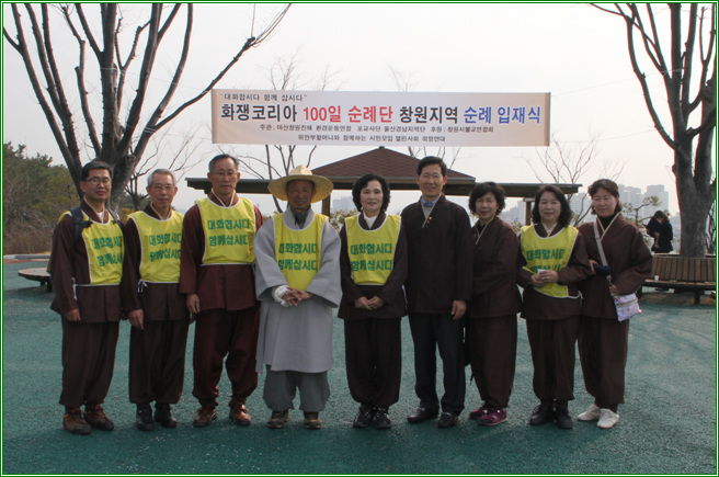 - [부산] 화쟁코리아 100일 순례 부산추진위원회(위원장 수불 스님)는 3월10일 부산의 상징물 중 하나인 영도다리가 바라보이는 영도경찰서 건너편 공터에서 입재식을 가졌다. 이날 입재식은 화쟁코리아 100일 순례단을 환영하는 의식을 시작으로 생명평화 100대 서원의 절, 영도다리 도개 관람, 경과보고, 축사 및 인사말, 선언문 낭독 등의 순서로 이어졌다. 입재식에는 도법 스님을 비롯한 화쟁코리아 100일 순례단원들과 조계종부산연합회장 수진스님, 상임부회장 원범스님, 부산불교연합회 사무총장 심산스님, 영도구불교연합회장 호법스님과 범어사 국장스님, 김희윤 영도구불교연합신도회장, 포교사단 부산지역 향적 강수대 단장과 부산지역단 포교사들 등 사부대중 500여 명이 동참했다.