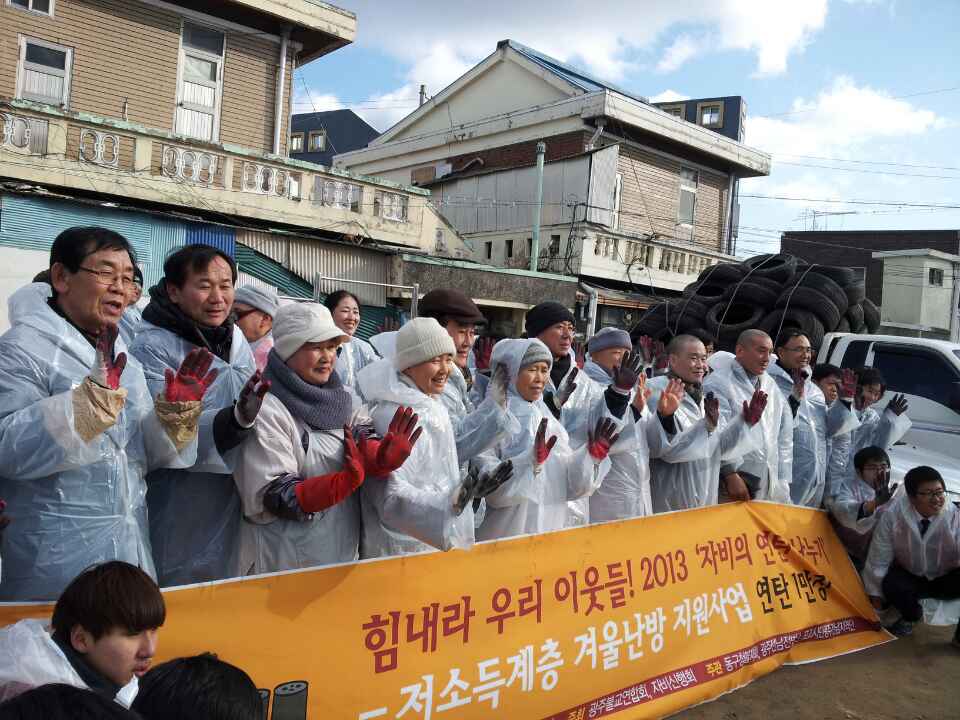 - [광주전남] 2013.12월27일(금)오후 2시 광주 동구 계림동 계림교회 주차장에 모 여서 “저소득 무의탁 독거노인” 가정에 연탄 배달이 있었다.광주 불교 연합회장 연광스님 및 연합회스님들,동구불자회,자비신행회,대해노인 복 지쎈타 자원봉사자,일반불자등이 참여 하였으며 우리 지역단에서는 범 진 정영균단장과 18기 덕원 조기남회장,각진 김홍범등이 동참하여 이웃 에게 연탄나르기 동사섭을 하였다.이 겨울 한파에 독거 노인들을 위해 봉사하다보니 추운줄도 모르고 훈훈한 열기만 마음에 남았다.