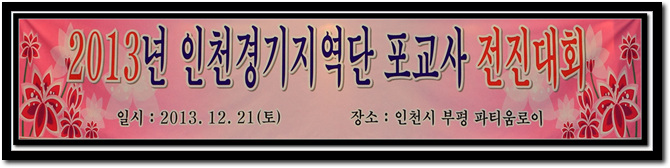 - [인천경기] ‘포교사전진대회 및 출범 3주년 기념법회’ 21일, 부평동 파티움로이에서…포교사 120여명 함께 대한불교조계종 포교사단 인천경기지역단(단장 덕암 전문기)은 12월 21일(토) 오후 5시부터 인천시 부평구 부평동에 위치한 파티움로이에서 포교사 120여명과 포교원 전법단장 계성스님을 모시고 불기 2557년 포교사전진대회 및 출범 3주년 기념법회를 봉행하였다. 지현(민이식) 부단장 사회로 진행된 1부 법회는 삼귀의, 한글반야심경봉독, 포교사의 노래를 합창하고 인천경기지역단의 올 한 해의 발자취를 영상으로 감상하였다. 이어 덕암(전문기) 단장님의 인사말과 조계종 포교원 전법단장 계성스님, 인천불교총연합회장 종연스님, 포교사단 인천경기지역단 지도위원 중원스님, 포교사단 최은자 부단장의 축사가 있었다. 포교원장 스님을 대신하여 해인 포교원 사무국장스님의 법문이 이어졌으며, 지난 한 해 동안 포교를 위해 열심히 봉사하신 포교사들께 공로포상을 수여하였다. 이어 8대 무애 김기호 단장의 취임사와 임원단 소개 그리고 성지화(김혜은) 포교사의 음성공양과 공지사항, 사홍서원을 마치고 기념촬영을 하였다. < 등록 > < 지현 민이식 부단장의 개회사 > < 한글 반야심경 독송 > < 포교사의 노래 제창 > < 인천경기지역단 1년간의 발자취를 영상으로 감상 > < 덕암 전문기 단장님의 인사말 > < 대한불교조계종 포교원 전법단장 계성스님의 축사 > < 인천 불교총연합회장 종연스님의 축사 > < 포교사단 인천경기지역단 지도위원스님 중원스님의 축사 > < 대한불교조계종 포교사단 단장의 축사 - 최은자 부단장님이 대독 > < 포교원 사무국장 해인스님의 법어 > < 해인스님의 법어 > 포교사 공로포상 < 포교사단 총재상 - 수원지역팀 덕인 민재호 포교사님의 수상 > < 총재상 수상자와 기념촬영 > < 포교사단장상 - 군3팀 수경행 안금녀 포교사님이 수상 > < 포교사단장상 - 인천지역2팀 성담 강경중 포교사님이 수상 > < 포교사단장상 수상자 기념촬영 > < 인천경기지역단장상 - 성남지역2팀 향공 김기수 포교사님이 수상 > < 인천경기지역단장상 - 인천지역1팀 혜천 김현수 포교사님이 수상 > < 인천경기지역단장상 - 김포강화지역팀 여수 윤성모 포교사님이 수상 > < 인천경기지역단장상 - 용인지역팀 보광 이현상 포교사님이 수상 > < 인천경기지역단장상 - 사찰문화해설2팀 보광 강원명 포교사님이 수상 > < 인천경기지역단장상 수상자 기념촬영 > < 8대 인천경기지역단 단장님의 취임사 > < 신임 무애 김기호 단장님의 취임사 > < 덕암 전문기 단장님께 재직기념패를 증정 > < 8대 임원단 소개 - 좌로 부터 무애 김기호 단장, 정수 김연순 수석부단장, 해동 박형진 부단장, 선월 김광우 부단장 운천 김상돈 인천지역총괄팀장, 보윤 이형 수원지역총광팀장, 보리심 박정숙 성남지역총괄팀장, 범상 윤종범 감사, 무인 신호승 감사> < 성지화 김혜은 포교사님의 음성공양 > < 단체 기념촬영 - 무대 좁아서 모두 같이 할 수 없어서 아쉬웠습니다 > < 기념촬영 - 8대 임원진과 함게 >