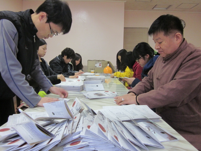 - [경남] 대한불교조계종 포교사단 울산경남지역단(선행심 이문자 단장)은 불기 2557년 1월 19일 10:00-15:00까지 지역단 사무실에서 2012년 하반기 감사를 실시했다. 이날 허유 최재봉, 화림 박용식 감사는 문서분야, 회계분야 등을 낱낱이 살피면서 문서처리 상태 및 예산을 목적에 맞게 집행했는지를 심도있게 감사를 실시하였다. 휴일임에도 불구하고 선행심 이문자(지역단 단장), 정지견 허점자(수석부단장), 정진화 노덕순(간사)은 감사들의 확인 요구사항 적극협조하여, 하반기 감사를 화기애애한 분위기에서 성실하게 수감 받았다. 사진/글 : 덕산 이승선 포교사단 울산경남지역단 자원봉사 행원팀/ 포교사단 중앙홍보위원
