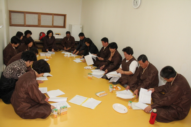 - [경남] 대한불교조계종 포교사단 울산경남지역단은 2012년 11월 10일 (토) 포교사단 임시총회 및 전문포교사 연수와 병행하여 불교문 화원에서 11월 정기운영위원회의를 봉행했다. 이날 울산경남지역단장(선행심 이문자)은 전월 회의결과보고, 회무보고, 재무보고, 기타토의, 안건심의 정기운영회의를 원만 하게 회향했다. 사진/글 : 덕산 이승선 울산경남지역단 자원봉사 행원팀/ 포교사단 홍보위원 lss5464@hanmail.net