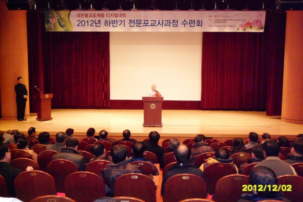 - [포교사단] 불기 2556년(2012) 12월2일 일요일 오전 10시 한국불교역사문화기념관 지하2층 전통문화예술공연장에서 대한불교조계종 디지털대학 전문포교사과정 하반기 수련회가 개최되었다. 삼귀의례와 반야심경에 이어 양성홍 디지털대학 부운영위원장의 인사말이 있었다. 양성홍 부운영위원장은 인사말에서 전문포교사과정 하반기 수련회에 교육열기가 뜨거움을 실감하며 그 어느때보다 성적이 좋다고 하시며 전문포교사는 더욱더 하심하고 자신을 뒤돌아보고 항상 수행과 포교를 겸비해 초발심으로 돌아가 더욱 노력하는 포교사가 되라고 당부하셨으며 포교원 사무국장 혜안스님은 격려사로 이어졌다. 혜안스님은 격려사에서 전문포교사는 한층더 낮은 자세로 포교에 임하여야 하며 포교사 한사람의 바른행동이 많은 사람들에게 타의 모범이 되도록 감동을 주어야 하며 더욱더 바른 행동과 생활로 불법홍포에 최선을 다해줄것을 당부하셨하셨으며 열심히 포교에 임하고 있는 대한불교조계종의 많은 포교사들을 격려하셨다. 이어서 첫 강의에 불교사회학과 특강으로 유승무 교수의 불교와 사회강의로 이어졌으며 점심공양에 이어 불교문화학과 유한근 교수의 불교와 문학으로 이어졌다. 총 180여명이 참석한 이날 디지털대학 제9기, 10기 하반기 수련회는 불교신행학과 특강에 동일스님의 불교수행 방법론으로 하반기 전문포교사과정 수련회의 모든 일정을 여법하게 종료하였다. 취재 남부총괄팀장 한애경 법용화