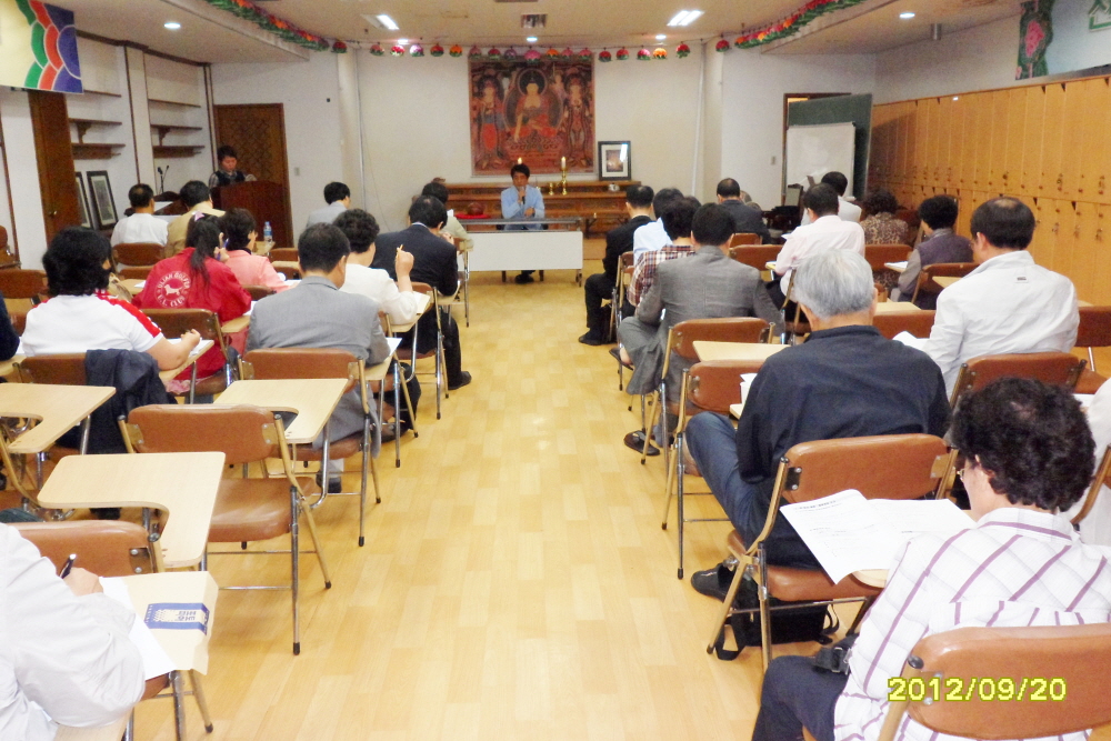 - [인천경기] 불기 2556년 9월 15일 토요일. 평소 운영위원회의를 진행 하던 지역단 사무실에서 벗어나 이 달에는 가 까운 근교의 인천경기지역단 소속 팀장이 운영하는 식당에서 운영위원회의를 진행하였습니다. 이날 운영위원회의에서는 지난달 운영위 결과 보고와 한 달동안 있었던 경과 보고를 하고, 다음으로는 안건 상정하여 회의를 진행하였습니다. 9월 8일 송광사에서 치뤘던 팔재계에 대한 평가가 있었고, 팀장 연수에 관한 건도 진행하여 11월 희망하시는 운영위원들을 대상으로 백령도 몽운사에서 1박2일 진행하 기로 의결하였습니다. 회의를 마치고 8재계 표창장 수여식이 있었습니다. 참여율이 가장 높았던 군3팀(팀장 남시우)에 금일 봉과 함께 표창장이 수여되었습니다. 식사와 함께 담소를 나누며 즐거운 운영위원회의가 진행되었습니다.