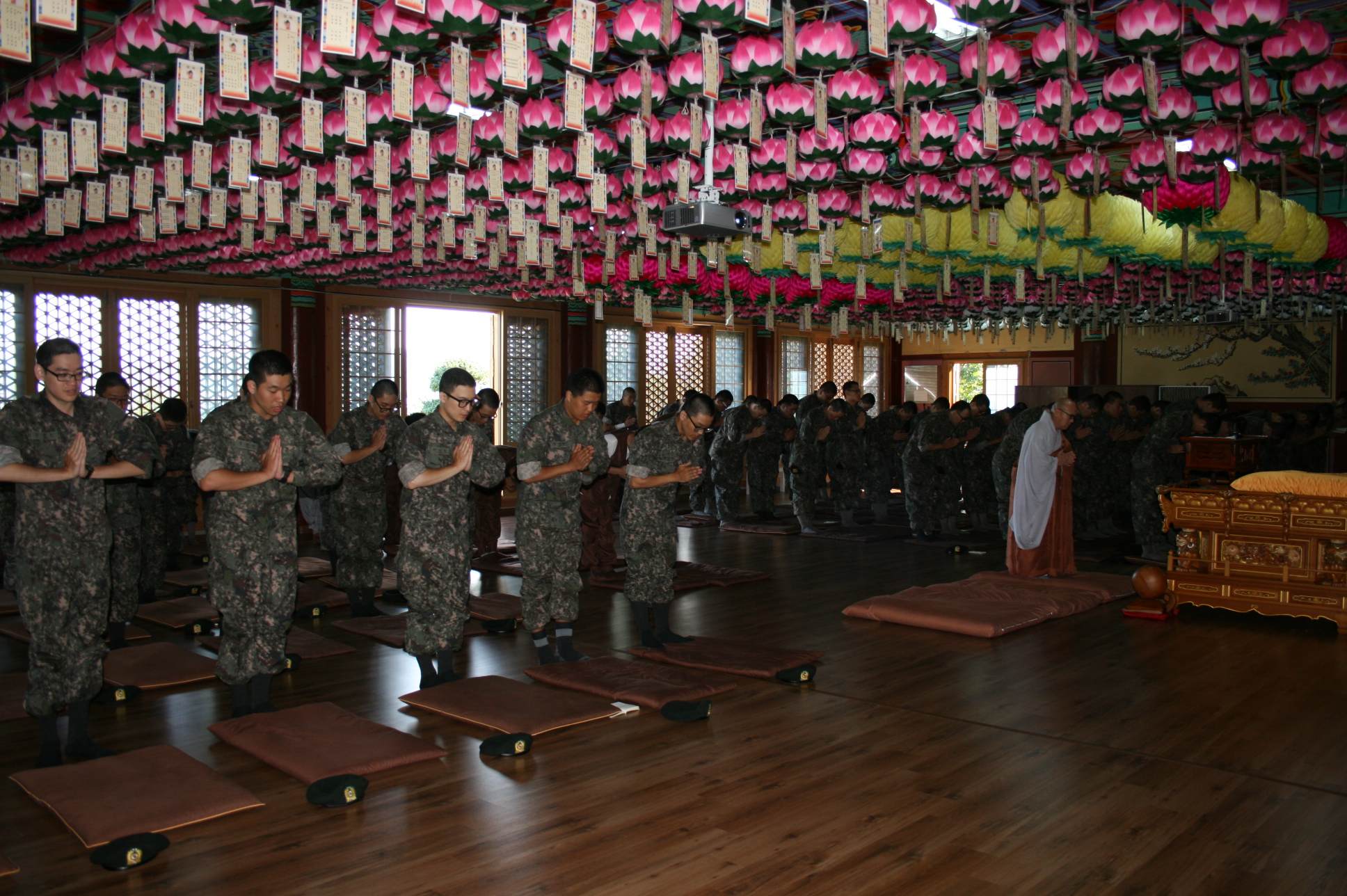 - [충북] 5교구본사 법주사 능인문화원 원장이자 마야사 주지이신 현진스님의 법문중 불법을 만나는것은 눈먼거북이가 통나무를 잡는것과같은 인연이라 설하신다. 포교사들의연비로 장병들은 긴장을하고 연비가 끝난 장병들의 손목에는 엄마같이 다정한 아줌마 포교사들이 아들같은 장병들에게 단주를 걸어주는모습이 아름답다