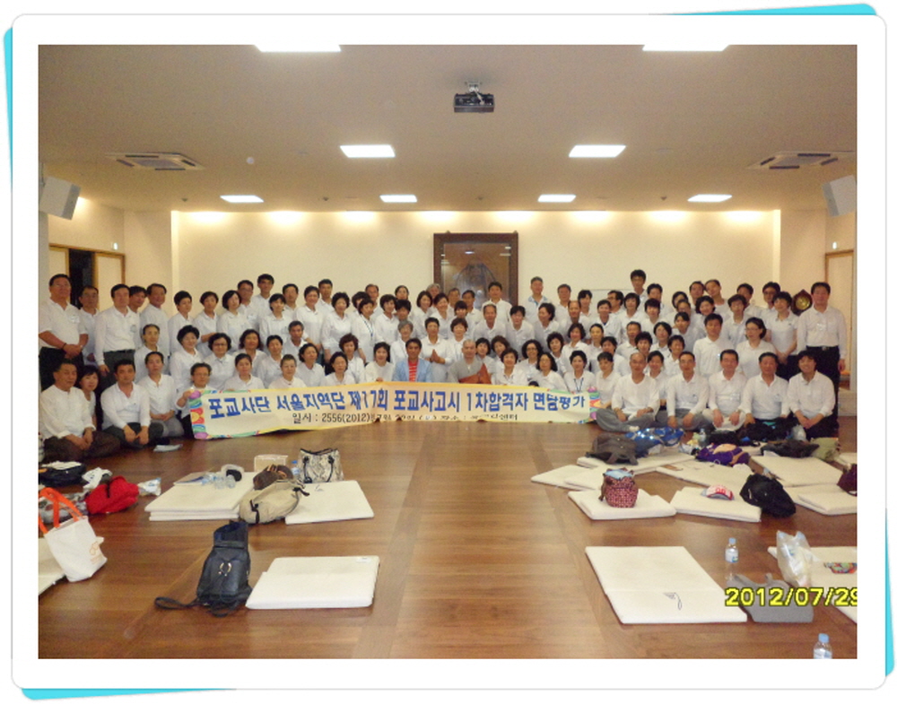 - [서울] 불기 2556년 (2012) 7월29일 일요일 오전 10시 대한불교조계종 포교사단 서울지역단은 제17회 포교사고시 1차 합격자들의 2차 최종 면담(면접) 평가를 실시하였다. 목동 국제선센터에서 실시된 이날 2차 최종 면담평가는 삼귀의례와 반야심경, 단장 인사말로 이어졌다. 계영석 단장은 인사말에서 무더운 삼복더위에 많은 17회 포교사고시1차 합격자가 참석하여 1080배 정진은 물론 최종면담 평가에 성실히 임해 모두 합격하기를 바란다며 최선을 다해줄것을 당부하였다. 포교국장 노휴스님의 환영사에 이어 서울지역단 부단장 그리고 총괄팀장들의 임원소계가 있었으며 곧이어 노휴스님의 포교사들의 수행자세에 대한 특강으로 이어졌다. 포교국장 노휴스님은 어린시절 출가를 결심하기까지의 경험담을 말씀하시며 포교사로써의 바른자세와 포교방향 그리고 포교에서 수행에 이르기까지의 구체적이고 실질적인 특강으로 제17회 포교사고시 1차 합격자들은 물론 참석해 봉사한 많은 포교사들에게 가슴에 와닿는 뜨거운 감동의 법문을 안겨주셨다. 노휴스님의 90분 동안의 특강에 이어 점심공양과 찬불가 교육이 있었으며 곧이어 선센터 7층 금차선원에서 1080배 정진과 동시에 4층 극락전에서는 스님의 면접과 함께 계영석 단장과 정청현 부단장이 참석한 가운데 면담이 진행되었다. 1080배 정진은 서부총괄 지역봉사1팀장 김덕중 포교사의 집전과 정운환 포교사와 이은갑 포교사등 많은 포교사들이 절 수행에 동참하였다. 11시간 동안 진행된 포교사고시 제 17회 1차 합격자들의 2차 최종면담은 밤 9시에 회향식과 기념촬영을 끝으로 여법하게 종료하였다. 취재 남부총괄팀장 한애경 법용화