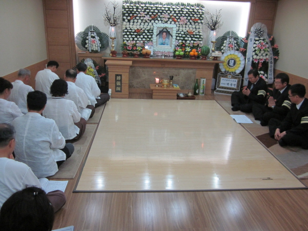 - [부산] 포교사단 부산지역단 염불포교 극락정토 팀의 염불봉사 봉행하다 일자 : 불기 2556년 8월12일(일요일) 오후 4시 장소 : 부산, 동구 초량동 소재 인창병원 장례식장 201호실 포교사단 부산지역단 염불포교 극락정토 (혜관) 이인재 팀장은 불기 2556년 8월12일 오후4시 (일정) 양준동 포교사, (연화심)노숙연 포교사, 해덕)장지혜포교사, (자산)손승완포교사, (능화)김이용포교사, (도문)곽철연포교사,(선명화)김옥분포교사, 운송)김석육포교사와 함께 동구 초량동소재 인창병원 장례식장 201호에서 염불봉사 팀원들은 예를 갖추고15기 (보림화)김미선 포교사 시모님의 별세에 극락왕생을 기원하는 염불봉사를 여법하게 봉행하였다 이날 (혜관) 이인재 팀장은 일요일에도 불구하고 바쁜시간을 내어 먼곳에서 달려와 팀활동의 염불봉사에 많이 참석하여주신 팀원들에게 고마움과 감사를 전하고, 우리들은 언제 어디서나 영가님들의 극락왕생을 위한 염불봉사를 할 마음의 준비를 항상 갖고 있으며 앞으로도 많은 활동과 염불포교에 힘쓰자고 당부를 하였다 이 아름답고 장엄한 모습을 홍보하기위해 저도 처음부터 끝까지 염불봉사에 참석하여 영가님의 극락왕생을 기원하였다 사진, 글 : 홍보위원 (고불) 이 종 석 합장 동구 초량동 소재 인창병원 장례식장 장례식장 대기실에서 자부 김미선님이 제15기 (보림화) 김미선 포교사 입니다 상주님들과의 상견례 염불봉사는 여법하게 봉행되고 재15기(보림화) 김미선 포교사 상주님들도 우리와 같이 염불봉사 법요집을 보며 염불봉사를 하고있다 집전 : (일정) 양준동 포교사(부산지역단 부단장) 약 1시간 20분 가량의 염불봉사를 끝내고 수고하신 염불봉사 극락정토임원들이 한자리에 모여 회향을 하였다 이 자리에 저 홍보위원 (고불) 이종석 포교사와 군포교 금샘팀(응천)김진규 팀장이 함께 참석하였다 다시한번 영가님의 극락왕생을 기원하며 수고많이 하셨습니다, 모두 성불하십시요 불기2556년 8월13일 부산지역단 홍보위원 :(고불) 이 종 석 합장