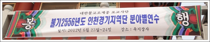 - [인천경기] 2012년 6월 23~24일 인천경기지역단은 경기도 양주에 위치한 육지장사에서 불기2556년도 분야별연수를 진행하였습니다. 1박 2일간 템플스테이 체험을 하며 지친 몸과 마음을 돌보는 시간이 됐고, 분야별연수를 진행하며 지역단 발전을 위한 열띤 토론과 사례발표를 통한 정보 공유도 할 수 있었습니다. 전문기 인천경기지역단장 포교원장 지원스님 분야별연수 포교사단장 표창 수여식-김진희 포교사 추나요법 쑥뜸체험 분야별연수 조별 사례발표 및 토론