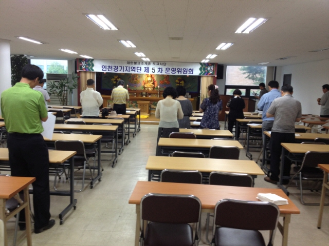 - [서울] 불기 2556년 (2012) 6월 21일 목요일 오후7시 대한불교조계종 포교사단 교육관에서 서울지역단 제6차 정기운영위원회의가 개최되었다. 개회사, 삼귀의례, 반야심경에 이어 계영석 단장의 인사말로 이어졌다. 계영석 단장은 인사말에서 서울지역단 총괄제의 안정과 활성화에 대해 각 팀장님들과 포교사님들의 적극적인 포교에 감사드린다는 인사말과 함께 본격적인 회의에 들어갔다. 고미애 부단장의 전 회의 결과보고 및 활동경과보고에 이어 안건상정으로 이어졌다. 안건 1. 추경예산 심의의 건 2. 서울지역단 예산 추경의 건 3. 서울지역단 분야별연수 포상 심의의 건 4. 무소유실천운동본부 사업의 건 상정된 모든 안건이 만장일치로 결의되었으며 공지사항과 사홍서원을 끝으로 서울지역단 제 6차 정기운영회의를 여법하게 종료하였다. 공지사항 1. 일인오화 포교 정진 동참의 건 정진 내용 : 천수천안 대다라니 주력 삼매체험 용맹정진. 정기 정진 : 매월 둘째주 금요일 오후 7~11시 참석 대상 : 포교단체, 신도단체, 중앙신도회, 기타 대중 장 소 : 조계사 대웅전 주최및 주관 : 대한불교조계종 포교원 2. 포교사단 감사, 사무국 직원 연수 일 시 : 2012년 6월30일 토요일 오전 10시~오후4시 장 소 : 대전시 코레일 대전충남본부 1층 비즈니스룸 대 상 : 지역단 감사, 지역단 사무국 직원 3. 2012년 포교사 자격 갱신 및 복권 일 시 : 2012년 6월4일 ~7월13일 까지 기 타 : 팀별 갱신대상자들을 팀장님께서 수합하여 지역단으로 제출해주시기 바랍니다. (복권은 중앙 사무국으로 접수) 4. 서울지역단 분야별 연수 일 시 : 2012년 7월14일 토요일 오후 1시~5시 장 소 : 한국불교역사문화기념관 전통문화예술공연장 대 상 : 포교사 복 장 : 단복 (하복) 5. 포교사단 해외연수 참가자 모집 일 시 : 2012년 10월말 추후 안내 예정 장 소 : 중국 (헤능선사의 발자취를 찾아서) 연수비 : 추후 안내 포교사단 해외연수비 계좌 : 국민 임희웅676502-04-022771 6. 자성과 쇄신 신청방법 www.buddhism.or.kr 메인화면에 자성과 쇄신 신청. 본인 원하는 날짜및 시간 지정. 신청시 소속란에는 반드시 "포교사단 서울지역단" 적을것. 7. 포교활동보고서 제출 방법 팀활동보고서는 팀장이 작성(개인활동보고서는 개인이 작성하여 팀장에게 제출함) 모든 포교활동보고서는 총괄팀장이 수합하여 매분기 익월말까지 지역단에 제출함 취재 남부총괄팀장 한애경 법용화
