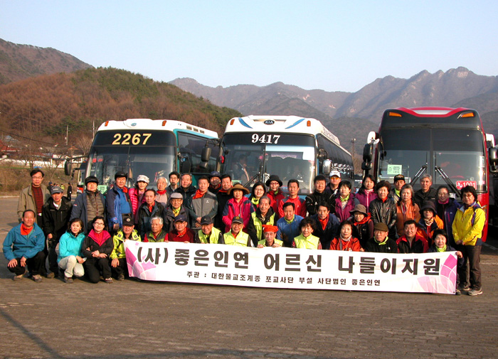 - [좋은인연] 사)좋은인연은 ‘어르신 나들이 지원 행사’로 계룡산 문화행사에 참석하였다. 어르신들은 불기2556년 4월 7일 국태민안을 기원하는 화합과 나눔의 문화행사에 참석하기 위해 아침 7시 조계사에서 버스를 타고 계룡산 동학사 제2주차장에 내려 행사에 동참하였다. 오전 10시부터 식전 행사로 ‘자비의 쌀 나누기 행사’와 조계사 길상풍물패의 풀물놀이, 난타공연 등의 문화행사를 즐길 수 있었다. 점심공양을 마친 어르신들은 삼사순례팀에 합류하여 동학사, 신원사, 갑사를 차례로 순례하고 17시 30분에 돌아오는 버스에 탑승했다. 사)좋은인연에서는 2011년도에 이어 2012년에도 ‘어르신 나들이 지원행사’를 계속할 계획으로, 오늘은 그 첫 나들이로 계룡산 문화행사에 참석한 것이다.