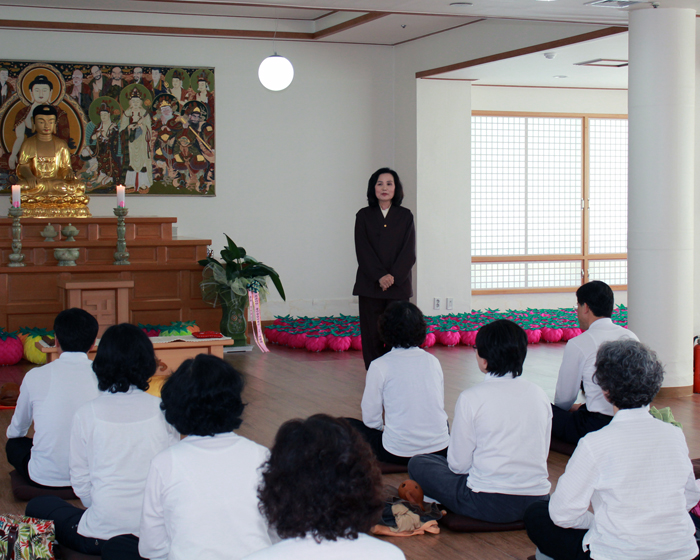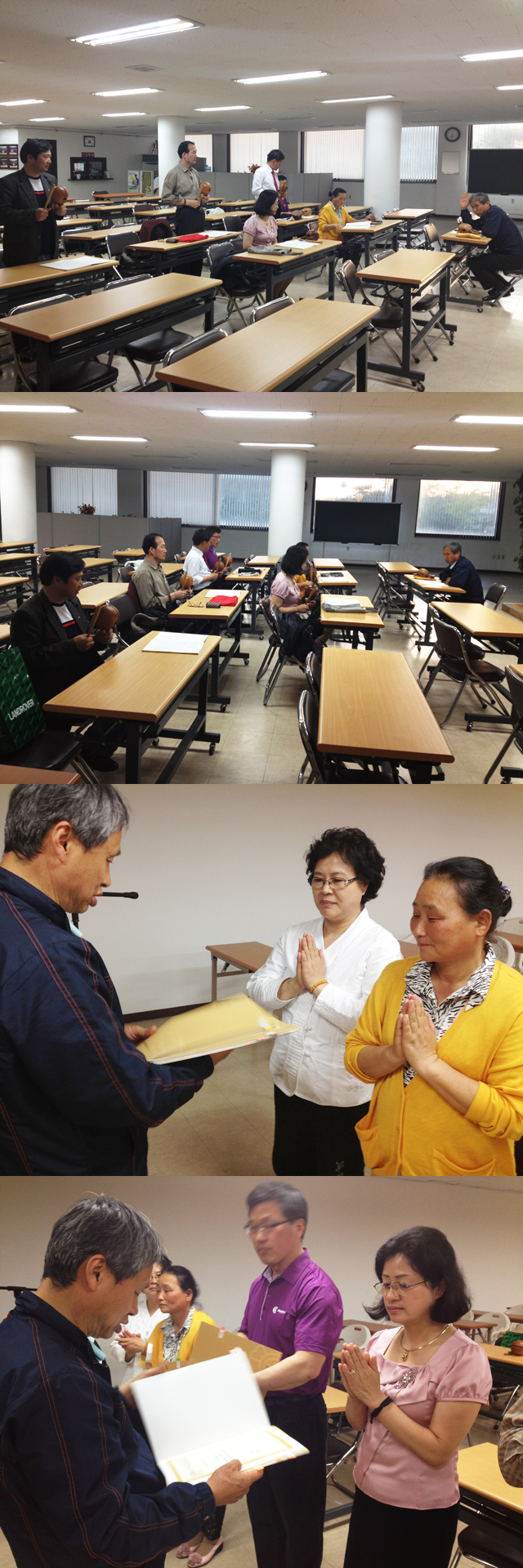 - [인천경기] 2012년 4월 30일. 인천경기지역단에서는 두달간의 장엄염불 교육을 마치는 수료식이 있었습니다. 3월 5일 시작된 장엄염불 교육은 덕암 전문기 인천경기지역단장의 교육의로 8번의 교육이 진행되었으며, 목탁 뿐만이 아닌 북과 징을 이용한 장엄염불까지 교육을 하는 심화교육으로 진행이되었고, 이 날 총 12명의 수료자가 있었습니다.