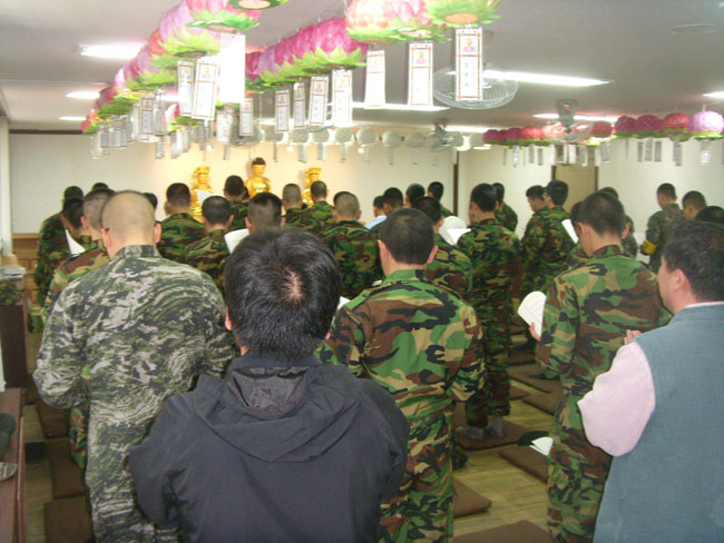 - [부산] 대한불교조계종 포교사단 부산지역단 군포교 금샘팀 4월 정기 법회 및 봉사활동 일자 : 불기 2556년 (2012년) 4월 15일 (일요일) 오후 5시 ~ 8시30분 장소 : 해운대구 중동소재 제 53사단 신병교육대 호국 흥 국 사 법당 포교사단 부산지역단 군포교 금샘팀 (응천) 김진규 팀장은 불기 2556년 4월 15일 (일요일) 오후 5시부터 해운대구 중동 소재 제53사단 신병교육대 호국 흥국사 법당에서 금샘팀 전원과 군장병 326명이 함께하는 4월 정기 법회를 봉행 하였으며 법회 후 군장병들의 사기 전진을 위해 노래방 기기 노래로 여흥을 즐겼으며 오후 8시 30분 경 여법한 법회를 봉행 하였다 이날 금샘팀(응천) 김진규 팀장은 공자를 통해 5월 정기 법회는 "부처님 오신날 수료 부모님 대 법회" 를 봉행 한다고 하였다 수료 부모님 대 법회 란? 제53사단 신병교육대에서 훈련을 마치고 기간 부대에 배치되어간 훈련병 부모님을 모시고 당신 자식들이 이곳 훈련소에서 아무 탈없이 훈련을 잘 받고 부처님의 법음을 들으며 생활을 한 법당에 그 장병 부모님을 모시고 현 훈련병과 같이 어울어지는 대법회를 봉행 하는 것 입니다, 해마다 부처님 오신날 기념법회로 수료 부모님 대 법회를 봉행하는 군포교 금샘팀의 불법홍포에 감사를 드리며 부처님의 제자로 부처님의 삶을 살아가려는 그모습에 두손 합장 올립니다, 군포교 금샘팀의 무궁한 발전과 그 가족에 부처님의 자비광명이 함께 하시기를 기원합니다, 성불하십시요 포교사단 부산지역단 : 홍보위원 : 이 종 석(고불) 합장