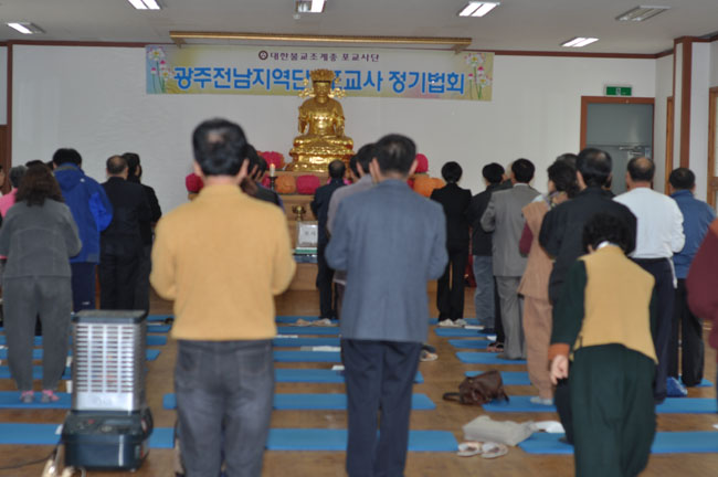 - [광주전남] 광주전남 지역단은 3월 31일 광주 무각사 불교회관과 불교대학에서 1차 합격자와 기존 포교사가 함께하는 정기 법회를 개최하였다. 이번 법회는 지난 2월중 운영위원회의에서 포교사들의 신심을 고양하고 우의를 돈독히 하기위하여. 포교와 가족이 함께하는 법회를 추진하기로 결의하여, 이번에 처음 실시하게 된 것이다 단에서는 이번 법회를 시작으로 매월 정기법회를 개최하되, 홀수 월에는 첫째 주 금요일 19시에, 짝수월에는 첫째 주 토요일 10시에 하기로 하였으며, 장소는 당분간 불교회관에서 실시하기로 하였다. 이번 법회는 11시에 삼귀의를 시작으로, 선철 김정연 수석부단장의 인사말씀이 있었고, 임원 소개와 팀장들의 팀활동 소개가 있었다. 당초에는 곧 바로 무각사 주지 청학스님의 법문이 있을 예정이었으나, 우선 공양을 하기로 하고, 오후 1시에 법문이 시작되었다. 청학스님은 포교사들의 청법가 소리가 우렁차다며, 열악한 우리 호남 지역의 불교가 포교사들의 목소리, 특히 남자 포교사들의 목소리가 우렁찬만큼, 매우 기대가 된다고 하였다.아울러, 포교사들이 중심이 되어 재가 불자의 모범이 되고, 하심하는 자세를 잃지 말도록 당부하였다. 단원들은 법회가 최종 마무리될 때까지 흐트러짐 없이 집행부의 진행에 따라 주었으며, 모두가 모처럼 얼굴을 대함에 따라 서로 반기고 격려하였다 이번 법회를 위해 모두가 협조를 아끼지 않았지만, 특히 자원봉사팀은 9시부터 나와서 법회 장소 마련을 하고, 프랑카드 설치, 좌복 운반 등 행사가 원만히 치루어지도록 협조하였다. 아울러, 이번 행사에 있어서, 사회를 맡은 임영광포교사와 문수행 조현옥포교사의 집전이 여법하게 이루어져, 보다 원만히 법회를 마무리 할 수 있었다