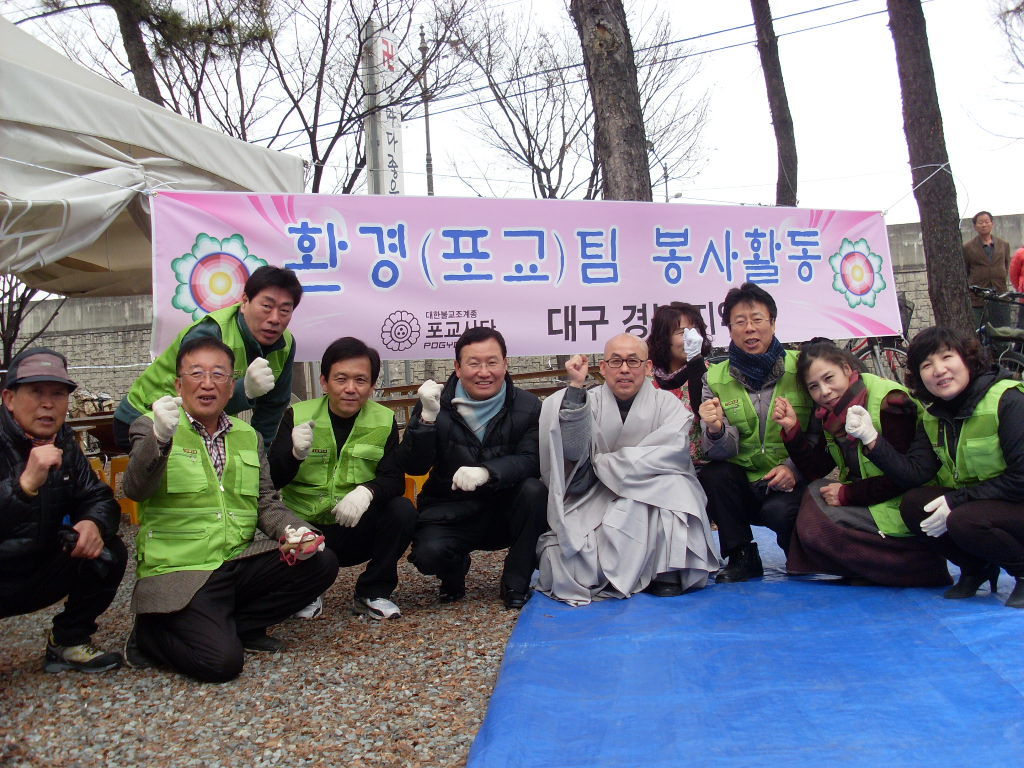 - [대구] 포교사단 대구경북지역단 환경팀(팀장 권오경 포교사)이 2월 월례회행사의 일환으로 소외 이웃들을 위한 무료급식 봉사를 실천했다. 2월28일 수성구 만촌동에 위치한 능화사(주지 혜강 스님) 부설 ‘엄마의 집’을 방문해 200여명의 소외 이웃들에게 공양을 올리고 생활고를 위로했다. 능화사 부설 ‘엄마의 집’은 매주 화요일 노숙자를 비롯한 장애인, 독거노인 등 200여명의 소외 이웃들에게 무료급식을 실시하고 있다. 환경팀 우희삼 총괄팀장과 권오경 팀장 등 9명의 포교사들은 이른 아침 부터 엄마의 집에서 봉사 활동을 펼쳤으며 우희삼 총괄팀장은 이날 급식비 일체를 보시했다.