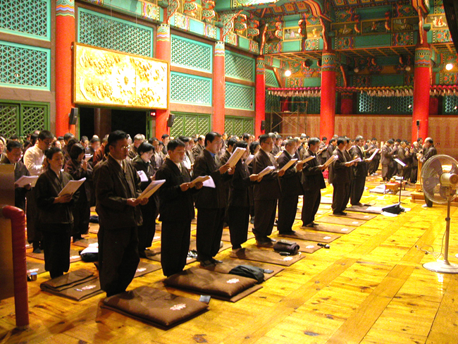 - [충북] 2011년 9월 24일부터 25일까지 팔공산 동화사에서 봉행되었다 6시30분 예불 식전 행사 혜총스님을 비롯해 스님 입장 단기 입장 제5기 전문포교사 및 16기 신규포교사 품수식 8재계수계법회 시작 동화사 부주지 무이스님 환영사 포교사단 임희웅 단장님 인사 말씀 단장상 수여 대표로 충북지역단 이우영 포교사(소속 홍보팀) 충북지역단 성석경 포교사님이 혜총스님으로부터 총재상 수여 받음 혜총스님 격려사 만남과 이별의 본질에 대해서 말씀 만났으니 이별, 만난다는 것은 어렵다 부처님 뜻을 각인한 자 만이 마음대로 할 수 있다 하셨다 시각 장애인 단체에 지원금 전달 포교사단 합창단 축가 16기 신규 포교사 품수식 (575명) 포교사증 수여 포교사 단복 수여 결의문 낭독 제5기 전문 포교사 품수식 (22명) 결의문 낭독 품수식 끝나고 잠시 휴식 시간에 충북지역단 안병옥 단장 전문포교사 품수 기념 촬영 8재계 수계 법회 참회 진언을 염하며 연비 11시부터 다음 날 1시까지 한글 금강경 독송 2독 통일대불 전에서 독송이 진행되는 동안 통일대불전에서는 임시 대의원회의가 열림 독송이 끝난 1시부터 경내 촛불 행진 3시 새벽 예불 4시 보살계 수계식 스므여드레 작은 달이 탑에 걸린 새벽 시간은 차가운 이슬이 내린 동화사 도량의 수계자 모두는 한기를 느낀다 5시30분 보살계 수계식 모두 마치고 임희웅 단장님 회향사 6시 차량으로 동화사에서 선본사 주차장으로 이동 아침 공양하고 9시 갓바위 참배 선본사 주차장에서 기념 촬영 후 10시 팔공산에서의 짙은 인연 뒤로하고 하루 밤 하루 낮 동안의 대법회 아름다운 회향을 하였다