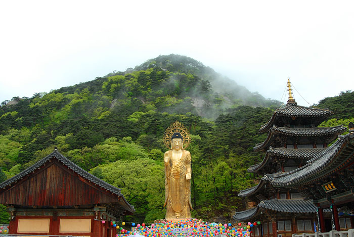 - [충북] 함께하는 나눔 실천하는 수행 대한불교조계종 제5교구 본사 속리산 법주사 봉축 법요식이 불기 2555년 5월 10일 오전 11시 법주사 대웅보전 앞에서 봉행되었다 명종 28타 개회식 - 삼귀의례 반야심경 사시예불 시작할 때까지도 비가 내려 대웅전에 행사 준비를 별도로 했는데 비가 멈춰 대웅전 앞 보리수 나무 아래 준비된 행사장에서 진행하였다 비가 멈춘 산사는 연초록의 색감이 더없이 예쁘게 빛나고 가녀린 잎파리들의 몸짓이 부처님 오신 날 축복 그 자체였다 부처님 전 헌화 시상식 포교사단 충북지역단 안병옥 단장님이 총무원장상을 받았다 감사패, 봉사상,공로상,장학금 전달,백일장수여 각 분야 수상자와 노현주지스님 기념 촬영 대한불교 조계종 제5교구 본사 법주사 주지 법기 노현스님 봉축사 이시종 충청북도 지사 축사 이기용 충청북도 교육감 축사 법을 청하는 청법가 비가 온 덕에 대웅전 뜨락에 작은 연못이 생기고 그곳에 연등의 반영이 아름답다 대한불교조계종 총지선원 선덕 함주스님 법어 마음은 부처를 빚어내는 진리의 원천이요 번뇌는 중생과 부처를 분별하는 근본이다 발원문 봉독을 하는 충북지역단 안병옥 단장님 덕 높으신 부처님 오심을 일심으로 찬탄 봉축 법요식 끝나고 관불의식 천상천하 유아독존 두 군데에 마련 된 아기 부처님 관불을 위해 사부대중 줄서서 기다리다가 정성껏 담은 한줄기 흐르는 물에서 하늘 아래 내가 존귀함을 깨닫는다 궂은 날이지만 부처님 오신 날을 봉축하기 위해 산사를 찾은 많은 불자들 비빔밥 한그릇과 떡 한봉지면 그 이상도 그 이하도 아닌 만인이 평등한 모두의 생일 날이 된다 방에 들어갈 수 없어 툇마루면 어떻고 흙마당이면 어떠랴 부처님 오신 날은 좋은 날 모두가 행복한 날이다 지역단 발전을 위해 늘 애쓰시는 안병옥 단장님 축하합니다 모두 성불 하세요 ()()()