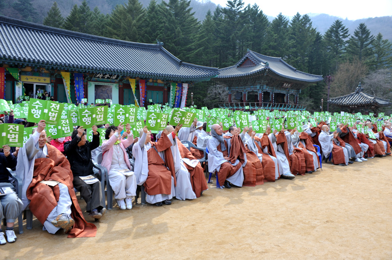 - [강원] 제4교구 본사 월정사(주지 정념스님)의 민족문화수호 및 자성과 쇄신 결사를 위한 사부대중 결의대회가 8일 오후 2시 월정사 팔각구층석탑 앞 광장에서 월정사 주지 정념스님, 포교원장 혜총스님, 김경연 포교사단 강원지역단장을 비롯한 포교사 100여명, 오상추 4교구 신도회장, 한명숙 전 총리, 권성동 국회의원, 4교구내의 본 말사 스님과 지역의 각급 기관 단체장, 등 사부대중 2000여명이 참석한 가운데 봉행됐다. 이날 결의대회는 일본대지진 희생자 추모에 이어 원행 월정사 부주지 스님의 민족문화 수호를 위한 주요활동 경과보고, 조선왕조실록 및 의궤 반환촉구 결의문 및 민족문화수호 및 자성과 쇄신 결사 결의문 채택 등의 순으로 진행되었다.월정사 주지 퇴우정념 스님은 대회사를 통해 “스스로 참회와 자정의 노력을 경주, 정체성을 회복하고 민족문화 수호의 시대적 사명을 다하도록 하자”고 강조했다.포교원장 혜총스님은 자승 총무원장을 대신한 격려사에서 “우리 삶에 습관처럼 길들여진 부정적 타성과 관행을 자성하고 한국불교가 새로운 모습으로 국민에게 희망과 감동을 줄 수 있도록 쇄신하고 결사의 정신으로 쉼없이 정진하자”고 당부했다. 자성과 쇄신을 통한 민족문화 수호에 대한 결의를 알리는 각종 번이 금강루를 장엄했다.