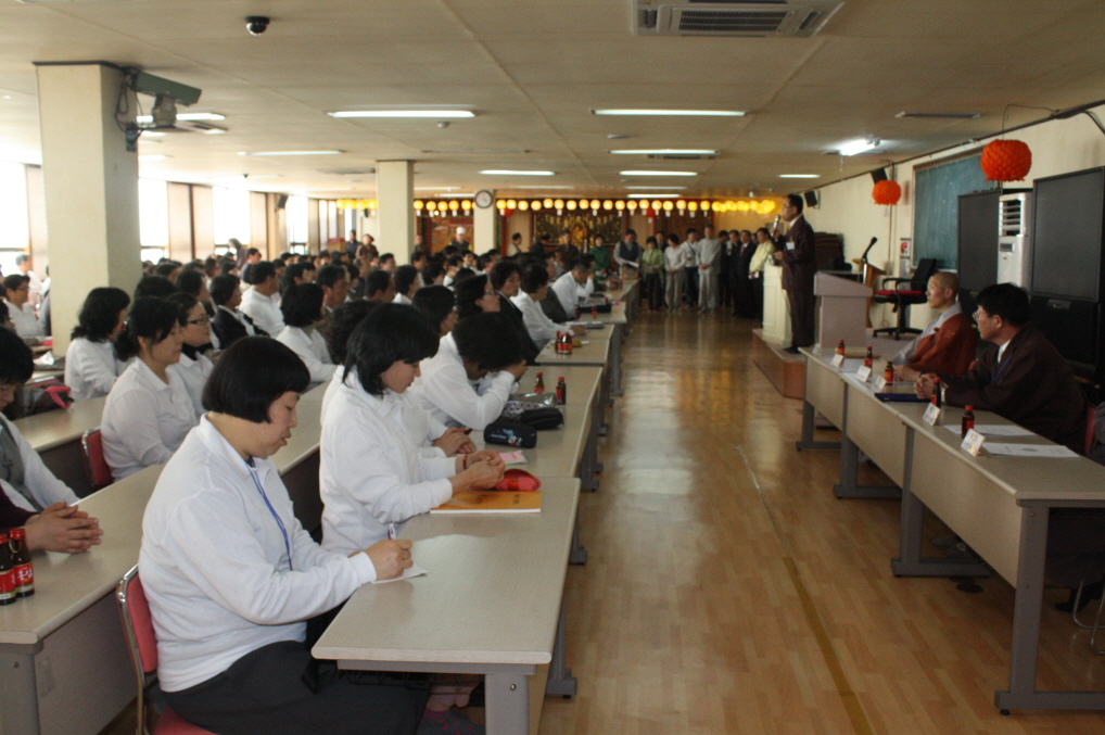 - [부산경남] 대한불교조게종 부산경남포교사단 부산지역단 지역벙사 동산팀 4월법회봉행 일자 : 불기2555년 (2011년) 4월 3일 (첫째일요일) 오전8시30분 장소 : 부산광역시 동래구 안락동 소재 새 안락병원 2층 정신과 병동 팀장 이춘배 포교사 외 팀원들은 4월3일 첫째 일요일 오전 8시 30분에 병원에 도착하여 법회내용과 진행에 대하여 논의하고 8시40분에 안락병원2층 정신과 병동에서 환우불자 50여명을 모시고 여법하게 법회를 봉행하였습니다, 이날 집전에는 홍종일(열심)포교사님, 집전보조 : 은숙이(법성화) 포교사님 사회에는 하경선(대해심) 포교사님 께서 수고하셨으며 그 외포교사님들께서는 환우들 옆에서 법회를 할수 있도록 도움을 주며 용기화 희망을 전하는 구도자 로서 열심히노력봉사하시는 모습이 너무 감사하고 뜻깊었읍니다, 법문에는 하경선(대해심) 포교사님께서 재산이 없어도 보시를 할수있다는 무재칠시에 대한 법문으로 많은 환우들께 뜻깊은 가르침을 전해 주었습니다, 법회 후 환우불자들에게 간단한 간식을 준비하였으며 다음 법회를 약속드리며 산회가로 법회를 봉행하였습니다, 또 동산팀원들은 30분 거리에 있는 청룡동소재 법당에서 사시예불을 봉행하며 팀원들의 단합과 다음 법회의 준비를 하는 월례회의로 팀 활동을 마쳤습니다, 동산팀원들의 무궁한 발전을 기원드리며 나날이 좋은 날 되시기를 축원 드립니다,
