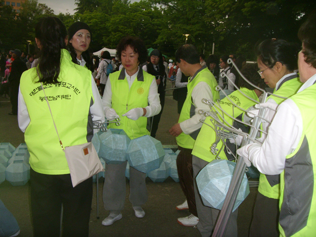 - [서울] 불기2554년 ‘연등회 연등축제’가 5월 16일 16시 동국대학교에서 봉행되었다.‘화합한마당’에서 그룹율동과 발표가 있었고 경연대회 시상과 관불의식이 있었다.올해의 경연대회 최우수상은 한마음선원에서 차지했다.개회가 선언되고 봉축위원장 자승스님의 개회사와 조계종 종회의장 보선스님의 경전봉독과 태고종 총무원장 인공스님의 남북불교도 공동발원문, 천태종 총무원장 정산스님과 진각종 통리원장 혜정스님의 기원문 낭독이 있었고 동국대학교 오영교 총장의 행진선언으로 연등과 장엄등의 행렬은 종로2가 탑골공원으로 향하여 ‘회향한마당’으로 이어졌다.동국대학교에서의 행사를 위해 구역책임자 포교사들은 10시에 운동장에서 모여 진행회의를 가졌고 제15기 포교사고시 1차합격자들은 11시까지 모여 지시사항을 듣고 조별로 맡은 임무를 수행하였다.임희웅 단장은 10시부터 동국대학교에서 포교사들의 활동을 감독하였고 13시부터 곳곳에서 활동하는 포교사들을 찾아 위문하였는데, 먼저 동대문운동장의 장엄등을 관리하는 이차환 환경특별위원장을 찾아 노고를 위로하였다. 이차환 위원장은 연주암의 염불회 정불회 회원들과 함께 장엄등 관리를 8년째 해오고 있는데, 이제는 8년의 경륜과 함께 능숙하고 깔끔한 일처리를 한다.다음은 조계사앞 우정국로를 찾았는데, 포교사단 어린이팀에서는 어린이들을 위한 특별행사를 준비하였다. 부스 1칸을 임대하여 어린이들에게 삼배하기와 목탁치기의 체험을 하게 하였고 풍선만들기와 바디페인팅, 선물로 단주와 동자승 인형을 나누어 주었다.우정국로의 많은 부스들 중 포교사단의 어린이팀 부스가 가장 의미 있고 붐비는 행사장이 되었다.임희웅 단장이 마지막으로 순회한 곳은 탑골공원 앞 회향한마당이 펴쳐질 곳이다.14시30분 서울경기포교사단 단원들은 모두 이곳에 팀별로 모여서 활동하였는데, 거리질서도우미나 봉축위원회를 도와 일했다.순회를 끝낸 임희웅 단장은 동국대학교로 돌아가 16시 ‘연등회 연등축제’에 참석해 내빈석에 앉아 그 후의 모든 일정을 내빈들과 함께 하였다.해마다 연등축제 때에는 포교사단에서 가장 큰 역할을 맡아왔다.동국대학교의 본행사장에서부터 탑골공원으로 이어지는 길목 곳곳에서는 포교사단의 노력이 눈부시게 빛나고 있었다.